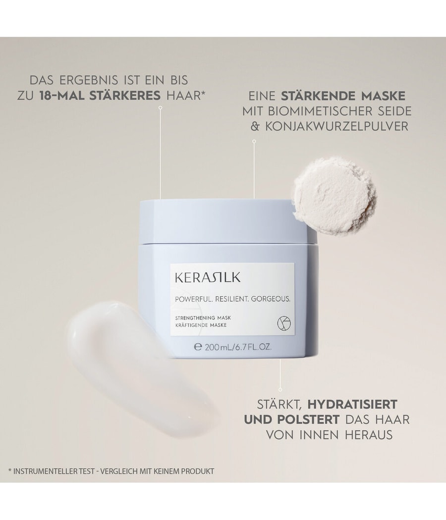 Маска для интенсивного глубокого кондиционирования с использованием биомиметического шелка и порошка корня коньяка. Наша 100% веганская формула укрепляет волосы, увлажняет и укрепляет их изнутри, делая их в 18 раз более упругими.