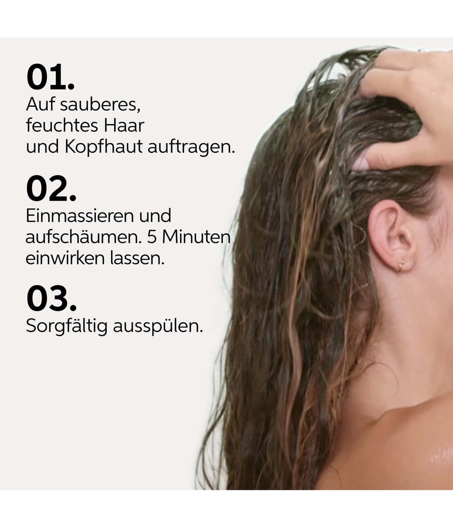 Применять после мытья. Втирайте в кожу головы и волосы и оставьте на 5 минут. Промыть.