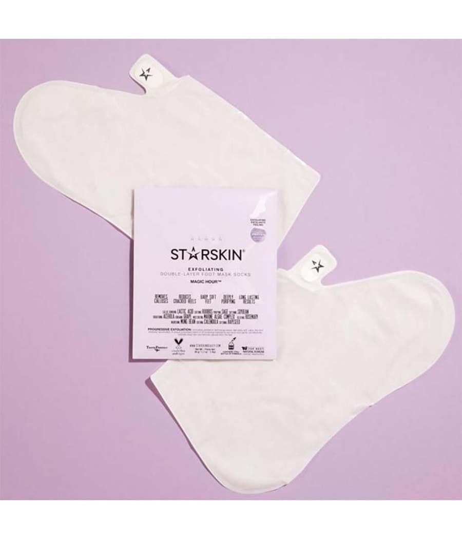 Сделайте ваши ноги шелковисто-мягкими с помощью носков для скраба для ног STARSKIN Magic Hour! Инновационная формула содержит молочную кислоту для мягкого и эффективного удаления мозолей и дряблых чешуек кожи без грубой очистки – для мягкого отшелушивания и питательного ухода за один раз. Уникальная смесь из 35 растительных ингредиентов, таких как успокаивающий ройбуш, соя, ацерола и календула, придаст новую энергию уставшим ногам и сделает кожу гладкой и мягкой.