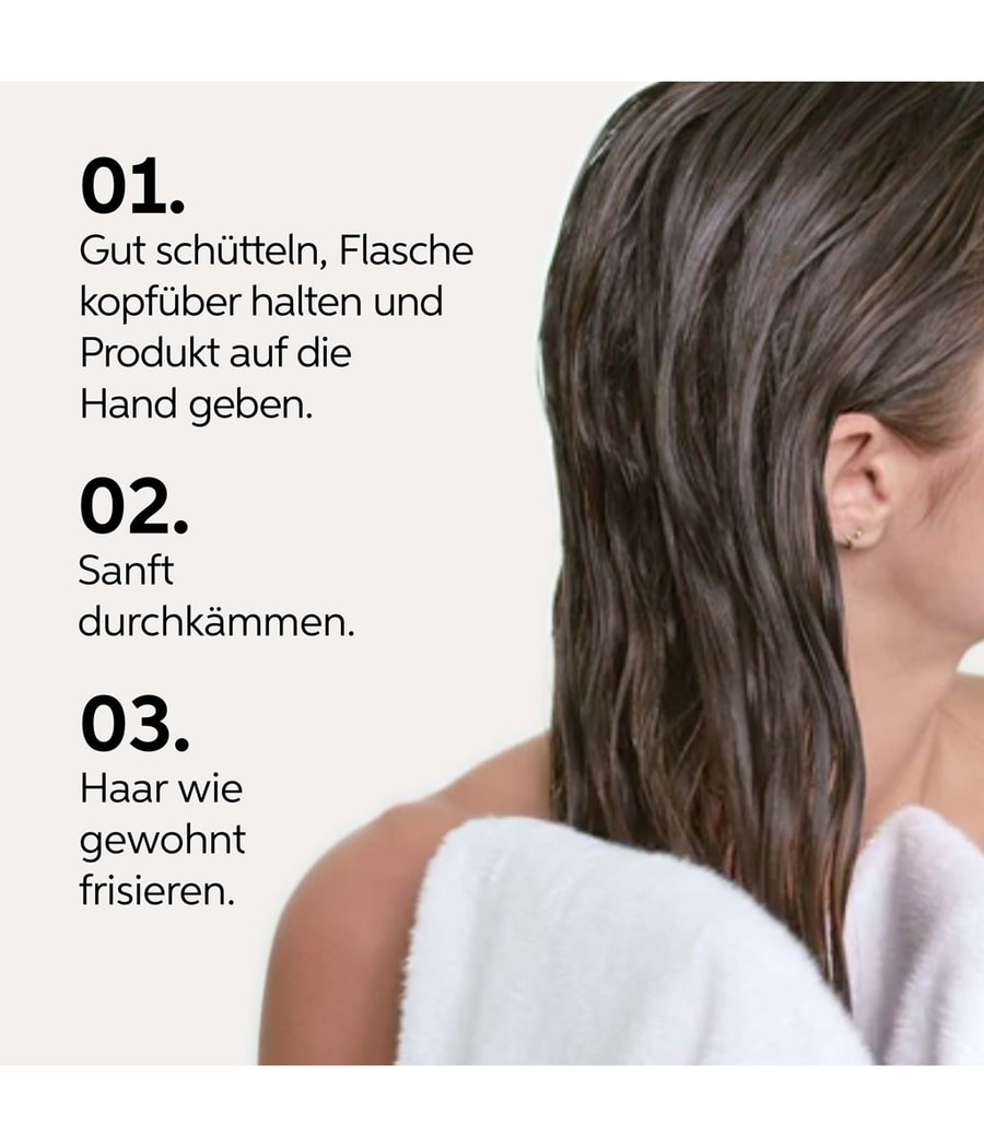 Хорошо встряхните. Держите вниз и дозируйте. Равномерно распределите по влажным волосам. Не смывайте.