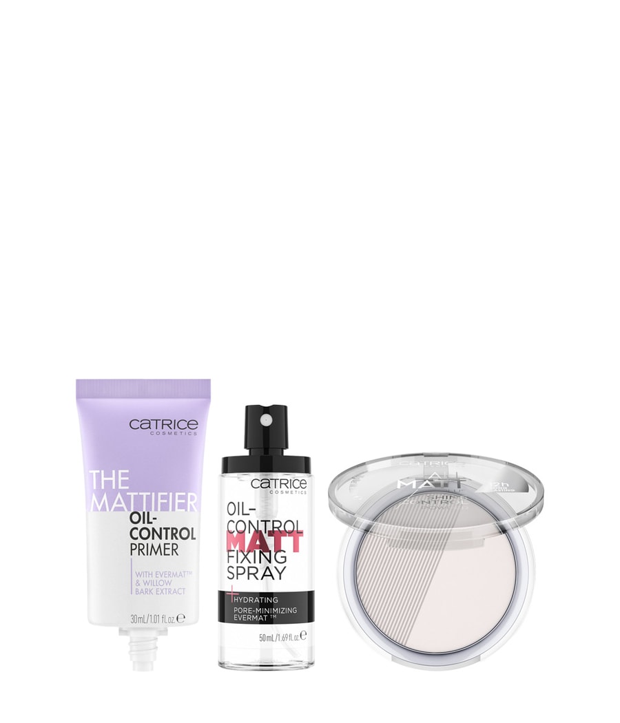 Три продукта для безупречного матового цвета лица: набор CATRICE The Matt Face Pro поставляется с матирующей пудрой, грунтовкой Oil-Control и закрепляющим спреем. Вместе они обеспечивают идеальную основу перед нанесением макияжа, антибликовый оттенок и идеальное закрепляющее покрытие. Жирные участки кожи становятся матовыми, а цвет лица становится ровным.