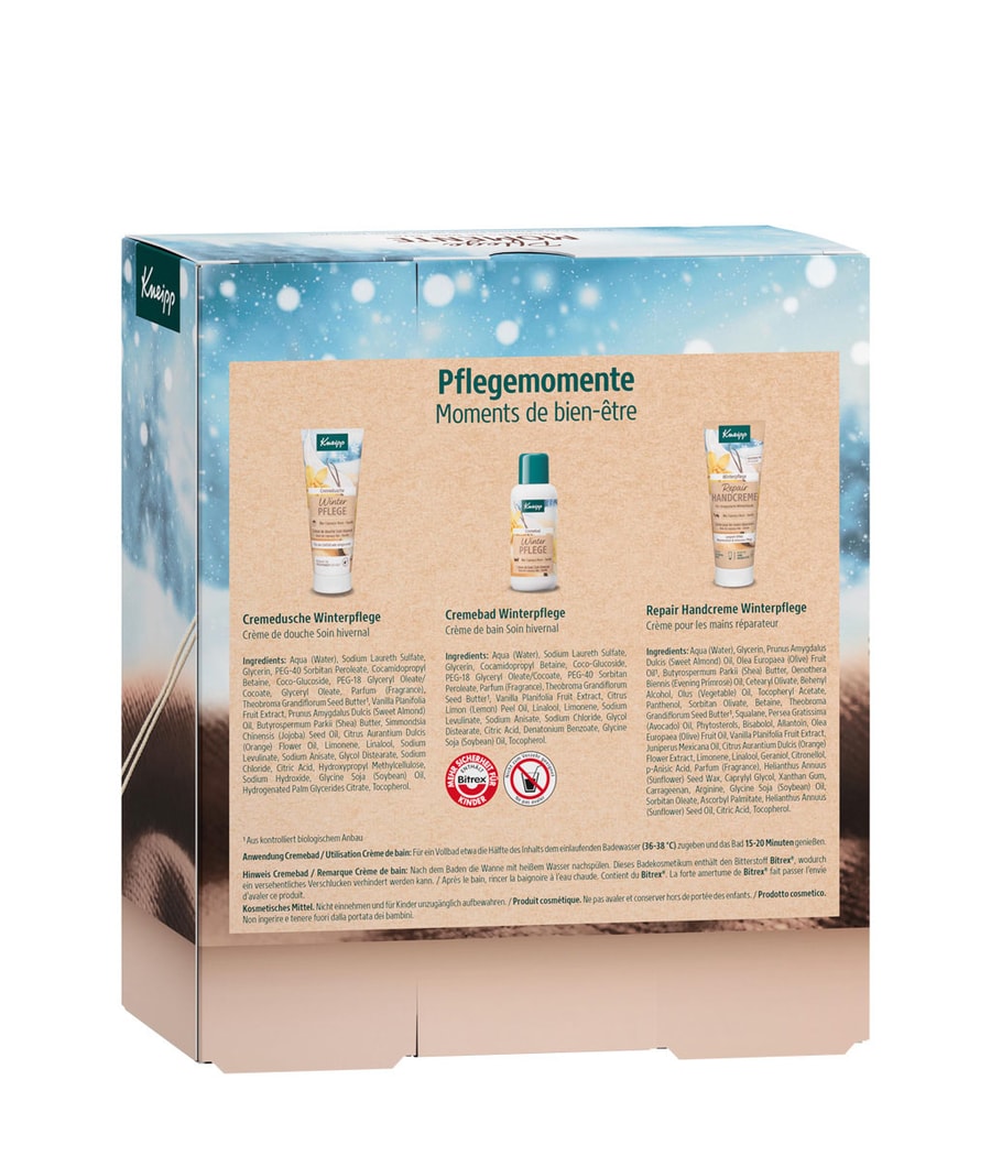 Подарите приятные моменты! Наш набор средств для ухода за кожей Kneipp идеально подходит для использования в качестве небольшого средства ухода в зимнее время и обеспечивает уют зимой благодаря своему приятному теплому, питательному и роскошному аромату. Холодная погода, долгие зимние прогулки, сидение у потрескивающего камина – все это то, что делает зиму прекрасной, но также может вызвать высыхание кожи. Поэтому в холодное время года необходимы средства, обеспечивающие интенсивный уход и увлажнение. Подарочный набор "Моменты ухода" предлагает здесь решение с комбинацией кремовой ванны, кремового душа и крема для рук.