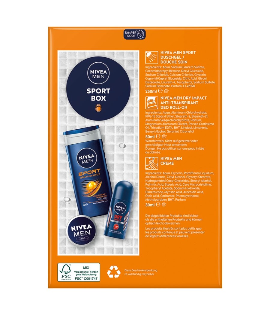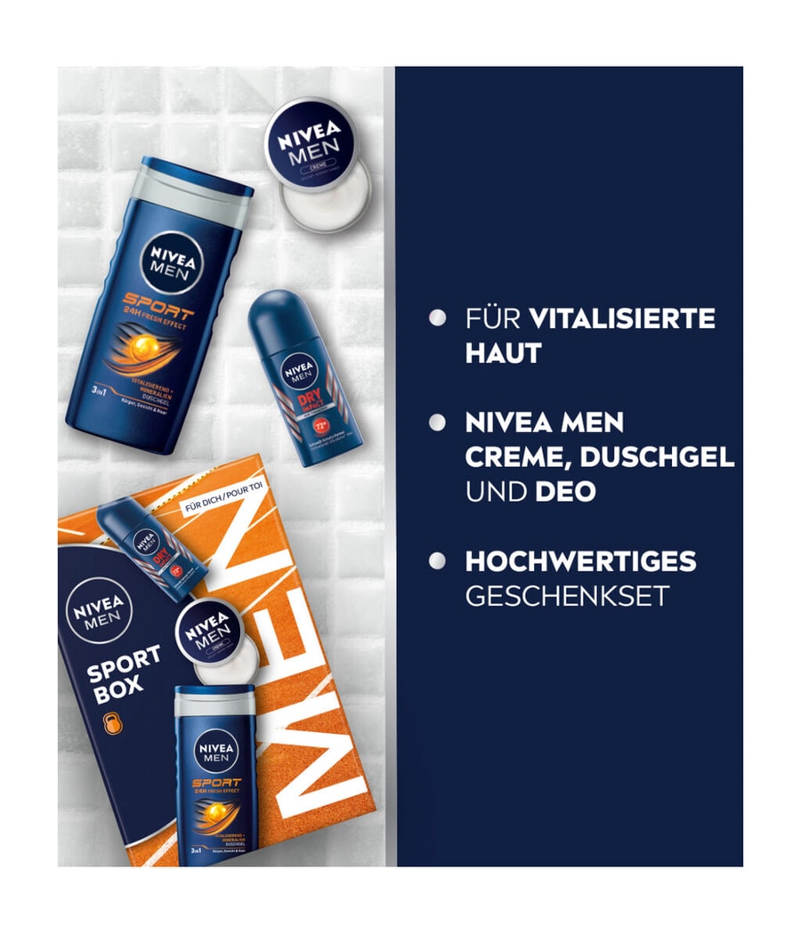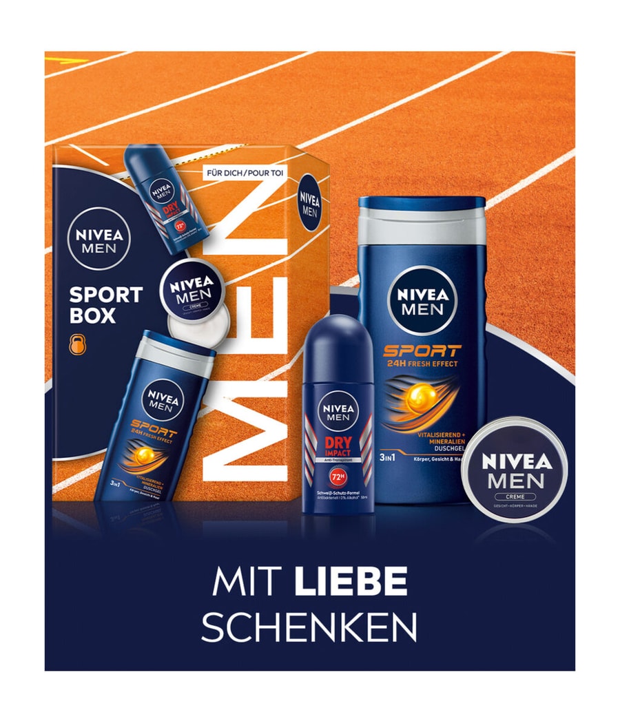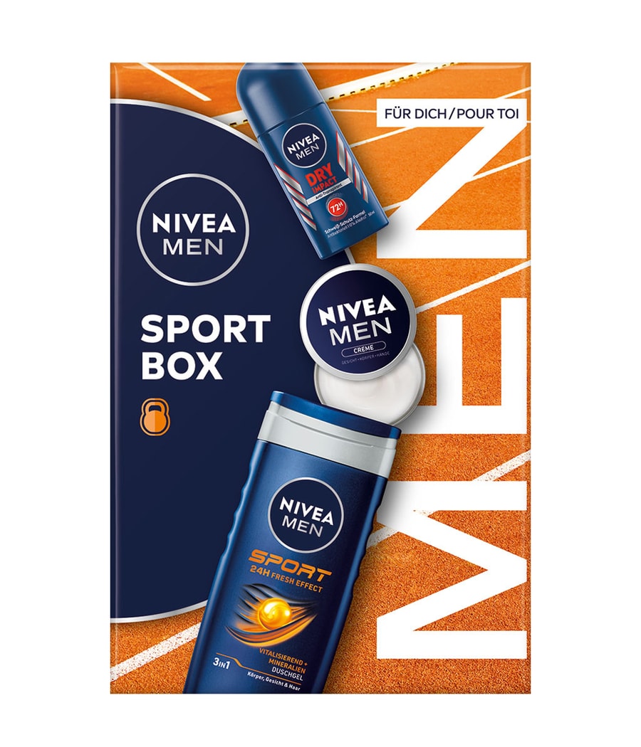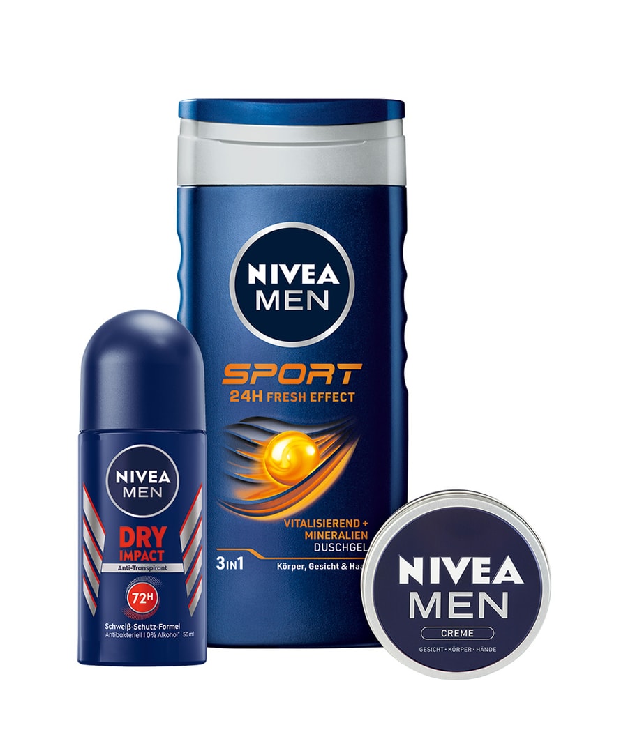 Удивите себя или своих близких с помощью спортивного бокс-сета NIVEA MEN Sport. Мужской крем NIVEA обеспечивает интенсивное увлажнение лица, тела и рук. Освежающий душ NIVEA MEN Sport обеспечивает освежающий душ. Насыщенный минералами, он оживляет и освежает кожу. Роликовый дезодорант NIVEA MEN Dry Impact идеально дополняет набор: обладая свежим мужским ароматом, дезодорант 72h обеспечивает эффективную защиту от подмышек и неприятного запаха тела.