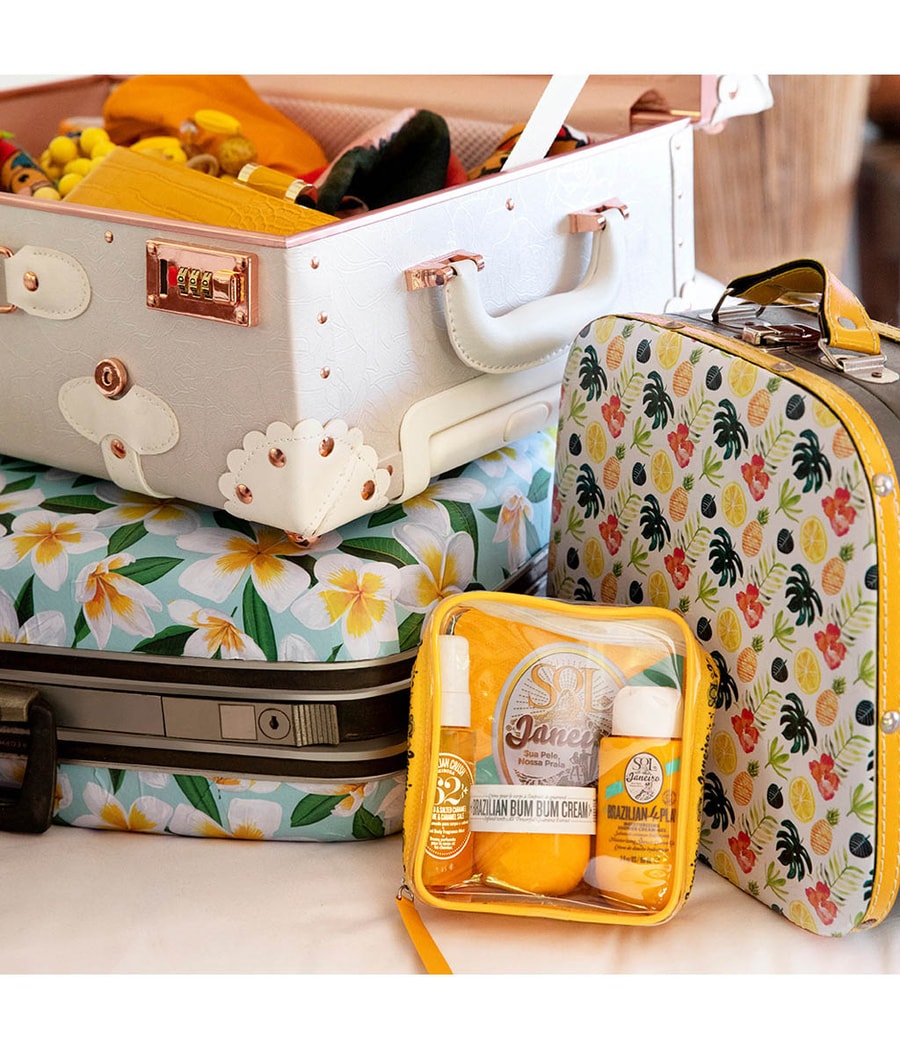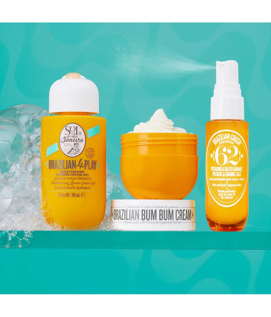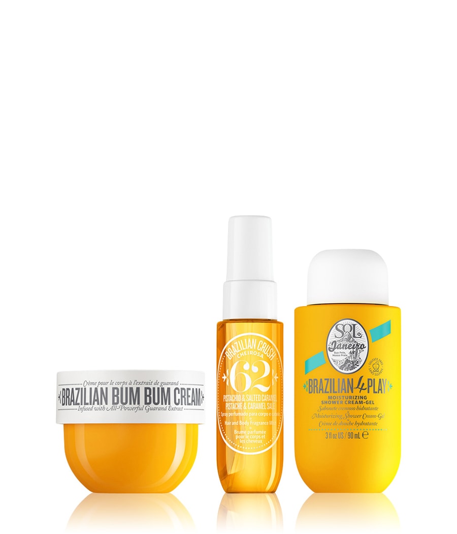 С набором Bum Bum Jet Set компания Sol de Janeiro воплощает мечту всех любителей реактивного движения о нежной, соблазнительно ароматной коже даже во время безостановочных путешествий. Три звезды Smarter Travel-Size по уходу за кожей создают команду мечты, которая обещает совершенно уникальные моменты ухода в любом месте и в любое время. Благодаря своей ультра-богатой формуле увлажняющий крем-гель для душа Brazilian 4 Play позволяет начать красоту уже в душе – включая небесный аромат. Бразильский крем Bum Bum Cream - это косметическая смесь питательного масла купуасу, мощного антиоксиданта асаи и питательного кокосового масла для неотразимо нежной кожи, а спрей для тела Brazilian Crush Body Fragrance Mist окутывает кожу солнечным ароматом Cheirosa ’62, в котором сочетаются нотки фисташек с ароматом соленой карамели.
