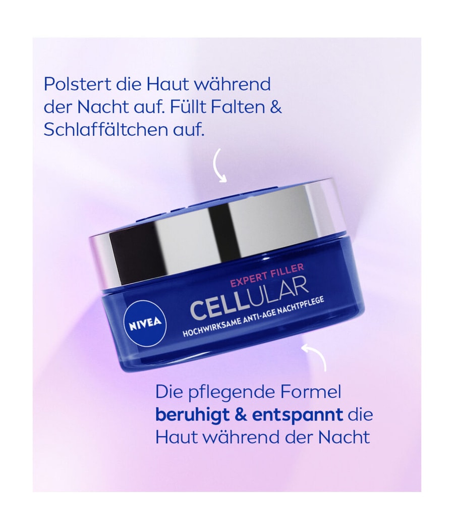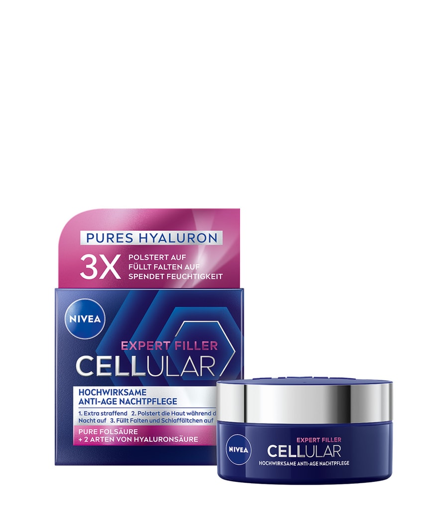 Ночной крем NIVEA CELLULAR Expert Filler с инновационной формулой содержит комбинацию высокоэффективных антивозрастных ингредиентов, которые создают эффект заполнения в течение 24 часов* и противодействуют потере упругости и объема, благодаря чему кожа выглядит моложе. Формула с: ЧИСТОЙ ФОЛИЕВОЙ КИСЛОТОЙ, незаменимым витамином, поддерживает эластичность волокон кожи*, делая ее более упругой и эластичной. МИКРО- И МАКРОГИАЛУРОНОВАЯ КИСЛОТА, два важнейших антивозрастных ингредиента, помогают эффективно заполнять морщины, разглаживать кожу и обеспечивать интенсивное увлажнение. Откройте для себя дополнительную регенерацию клеток в течение ночи, которая поддерживает естественный процесс обновления кожи и придает ей свежий и отдохнувший вид. *Продемонстрировано in vitro.