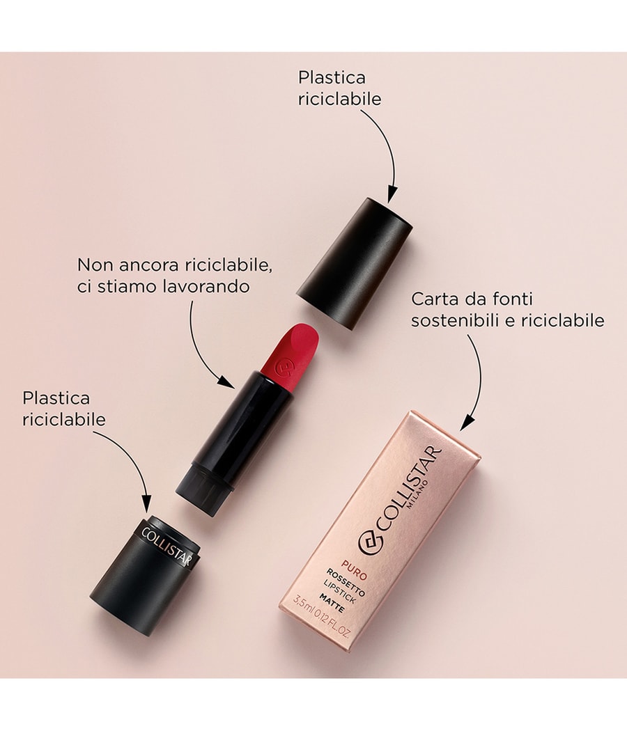 После необычайного успеха помады PURO, которая сочетает в себе макияж и уход за кожей, обеспечивая цвет и уход, комфорт и увлажнение, теперь появился новый вариант с матовой отделкой. Благодаря формуле помады PURO последнего поколения МАТОВАЯ ПОМАДА покрывает губы тонкими, непрозрачными и стойкими цветными пигментами, подобранными в соответствии со строгими стандартами Collistar Clean Research. Его длительное действие придает губам эластичность и увлажняет их.