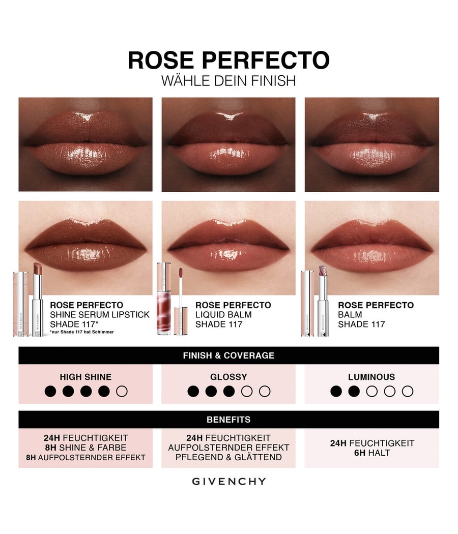 Откройте для себя помаду Rose Perfecto Shine Serum Lipstick, гибридную помаду, сочетающую в себе уход и цвет, для создания ультра-блестящих губ. Насыщенные цвета, дополненные мощным пухлым комплексом, сочетающим гиалуроновую кислоту и витамин С, обеспечивают 8 часов увлажняющего ухода ** и 24 часа увлажнения**. Тающая текстура „масло в палочке“ * обволакивает губы комфортом, придавая им сияющий вид всего за одно нанесение.
