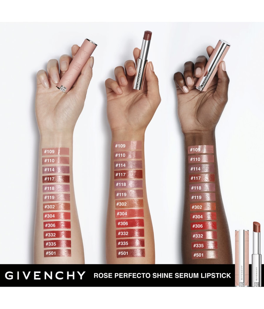 Губная помада Rose Perfecto Shine Serum Lipstick отличается еще более модным дизайном. Верный кодам Givenchy, он помещается в кожаный футляр, украшенный ультрачистыми деталями и монограммой 4G.