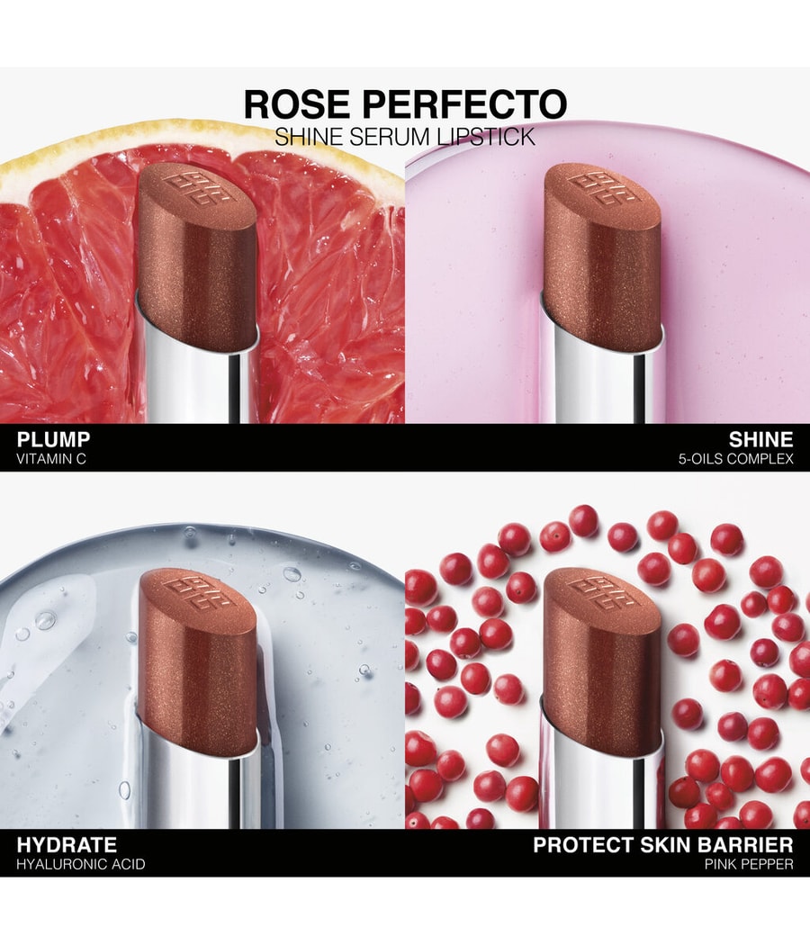 Откройте для себя помаду Rose Perfecto Shine Serum Lipstick, гибридную помаду, сочетающую в себе уход и цвет, для создания ультра-блестящих губ. Насыщенные цвета, дополненные мощным пухлым комплексом, сочетающим гиалуроновую кислоту и витамин С, обеспечивают 8 часов увлажняющего ухода ** и 24 часа увлажнения**. Тающая текстура „масло в палочке“ * обволакивает губы комфортом, придавая им сияющий вид всего за одно нанесение.