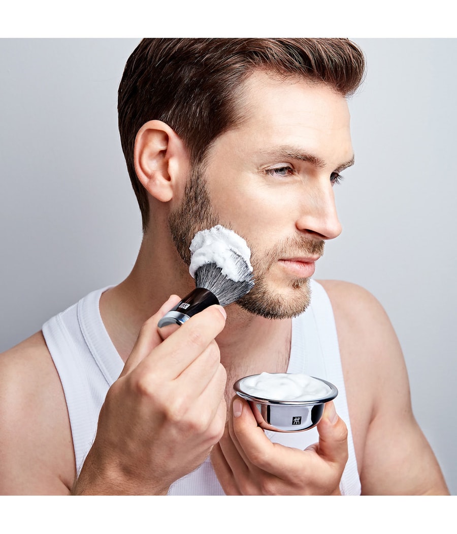 Подготовка: Ненадолго подержите кисточку для бритья под теплой водой, а затем один раз энергично встряхните. Его можно начинать непосредственно с намыливания, потому что, в отличие от кистей из натуральных волос, щетку-близнеца не нужно замачивать в воде.