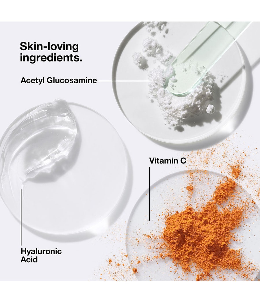 С добавлением витамина С и ацетилглюкозамина эта мощная формула помогает усилить сияние, разглаживая внешний вид кожи и заметно выравнивая тон кожи с течением времени.