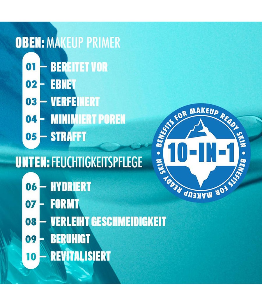 Перед нанесением макияжа нанесите на лицо охлаждающий праймер и увлажняющий крем 10-в-1 и дайте ему впитаться. Таким образом, кожа будет достаточно увлажнена и готова к дальнейшему нанесению макияжа. Дополнительный совет: Для оптимального ухода по-прежнему используйте охлаждающие прокладки для лица с морозильной камерой под глазами. Тогда процедура криотерапии завершена.