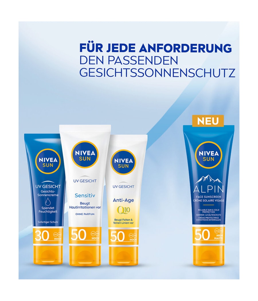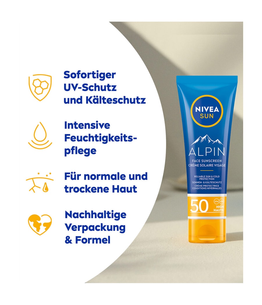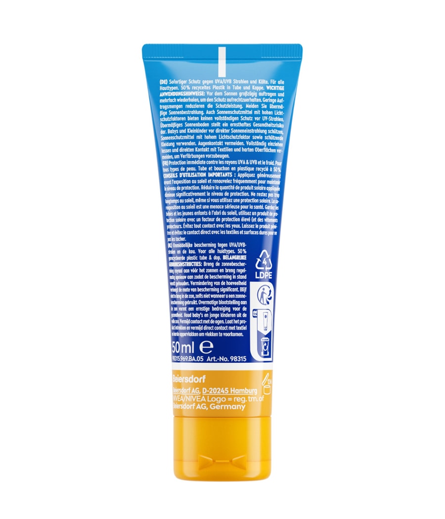 Солнцезащитный крем NIVEA SUN UV для лица Alpin разработан специально для чувствительной кожи лица. Этот солнцезащитный крем обеспечивает надежную и мгновенную защиту от ультрафиолета / ультрафиолета даже зимой. Легкая формула увлажняет кожу и предназначена для людей с нормальным / сухим типом кожи. Формула подтверждена офтальмологами. Кожная совместимость подтверждена дерматологически.NIVEA SUN стремится минимизировать воздействие на окружающую среду. Формула на 68% биоразлагаема и защищает море, поскольку не содержит УФ-фильтров, таких как октиноксат, оксибензон и октокрилен, а также не содержит микропластиков. Трубка и крышка на 50% изготовлены из переработанного пластика. Складная картонная коробка тщательно отобрана и сертифицирована FSC.УФ-излучение для лица предназначено для нормальной / смешанной, нормальной / сухой, чувствительной и нормальной кожи.