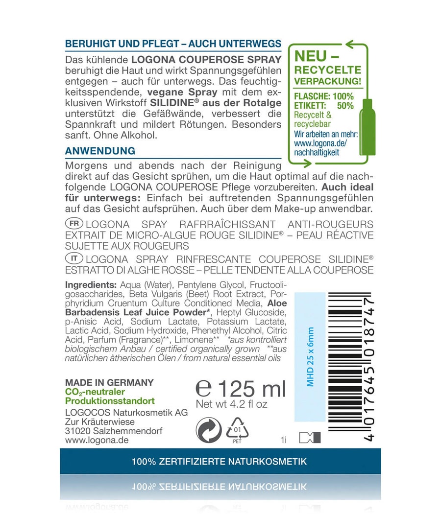 Охлаждающий СПРЕЙ LOGONA COUPEROSE успокаивает кожу и быстро снимает чувство напряжения, в том числе на ходу. Увлажняющий спрей с эксклюзивным активным веществом SILIDINE из красных водорослей укрепляет стенки сосудов, повышает их тонус и надолго снимает покраснение. Особенно нежный. Без алкоголя.
