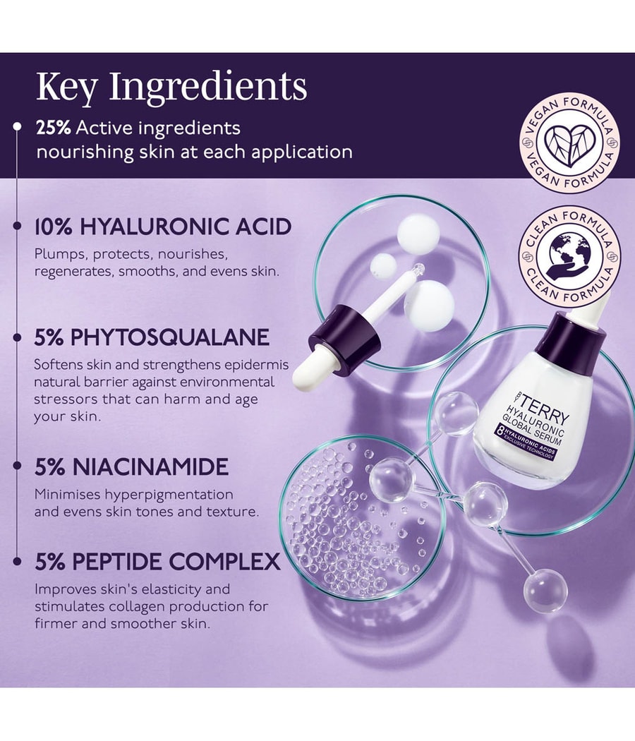 Этот мощный усилитель молодости наполняет несколько слоев кожи рекордной концентрацией гиалуроновой кислоты в 10%. Известно, что эти активные ингредиенты притягивают и удерживают влагу, естественным образом вырабатываются в организме и их количество уменьшается с возрастом. СЫВОРОТКА HYALURONIC GLOBAL SERUM содержит 8 типов гиалуроновой кислоты с 3 различными молекулярными массами: низкой, средней и высокой, что обеспечивает глобальное всасывание от поверхности кожи до эпидермиса и глубже. Высокомолекулярная гиалуроновая кислота обеспечивает мгновенное и интенсивное увлажнение верхних слоев кожи и предотвращает обезвоживание. Гиалуроновая кислота средней молекулярной массы уплотняет кожу и обеспечивает более гладкую поверхность кожи. Низкомолекулярная гиалуроновая кислота обеспечивает более глубокое и длительное увлажнение эпидермиса. Формула также обогащена: Ниацинамидом 5% (или витамином B3) для минимизации гиперпигментации и выравнивания тона и текстуры кожи Пептидами (5%) — идеальными активными веществами, омолаживающими кожу, — для повышения ее эластичности и стимуляции выработки коллагена для более упругой и гладкой кожи Фитоскваланом (5%) для смягчения кожи и укрепления ее естественного барьера против стрессовых факторов окружающей среды, которые повреждают и старят ее 91% ингредиентов имеют натуральное происхождение. Веганская и чистая формула.