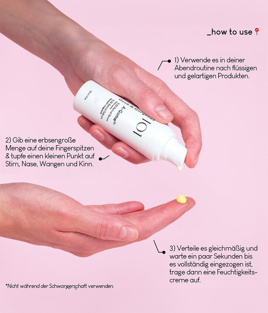 Если вы впервые используете A-Game 20, вам следует постепенно увеличивать его использование до 1-2 раз в неделю в течение двух недель. Если вы хорошо его переносите, через две недели вы можете перейти к каждому второму вечеру и, наконец, - если ваша кожа это переносит - к каждому вечеру. В зависимости от чувствительности вашей кожи, вы также можете использовать A-Game 20 вокруг глаз и на шее, но, пожалуйста, используйте только небольшое количество и корректируйте частоту использования в соответствии с индивидуальным уровнем переносимости вашей кожи.