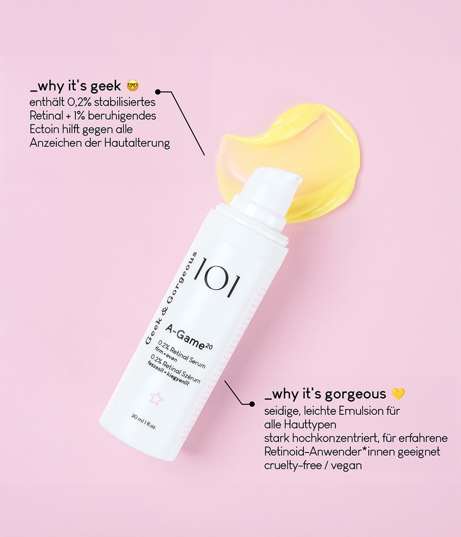 Наша высокоэффективная сыворотка Retinal Serum содержит 0,2% стабилизированного ретинальдегида и 1% успокаивающего эктоина, которые заметно противодействуют всем признакам старения. A-Game 20 — шелковистая, легкая эмульсия, идеально подходящая для всех типов кожи.