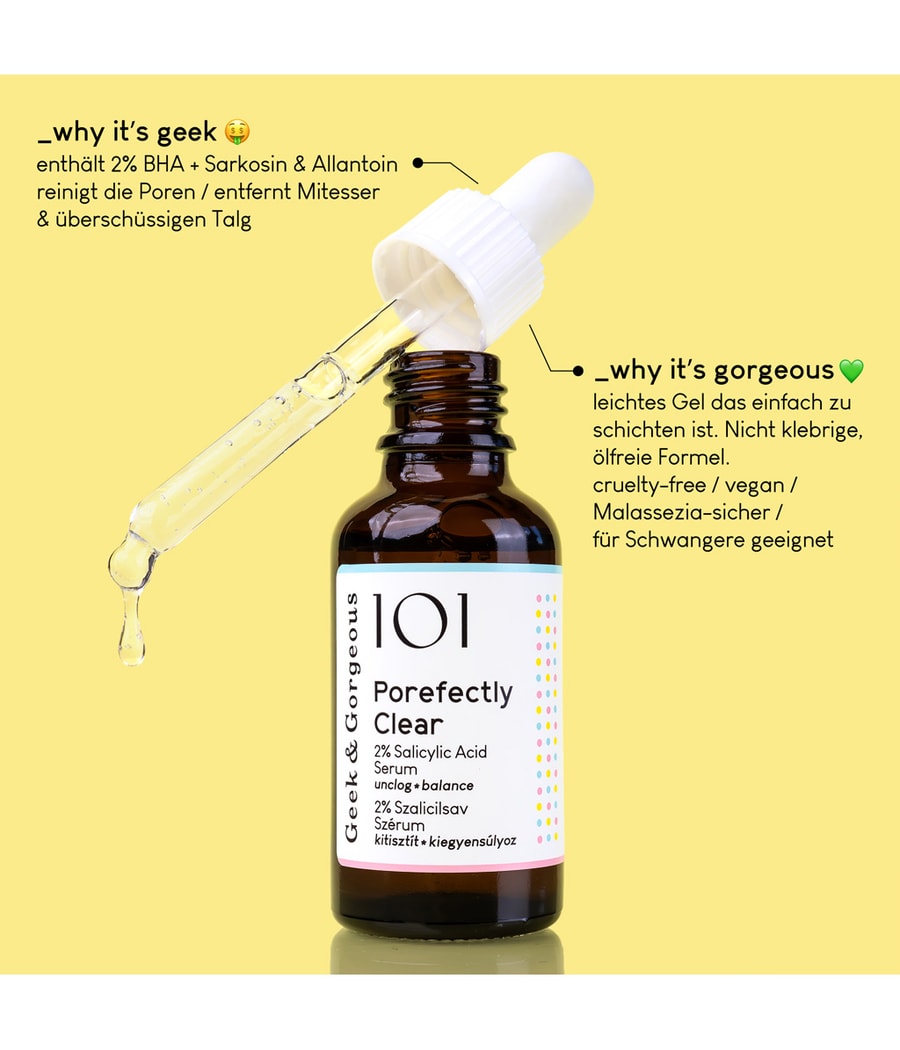 Geek & Gorgeous Porefectly Clear — отшелушивающая сыворотка с 2% салициловой кислотой (BHA), саркозином и аллантоином, которая очищает закупоренные поры и визуально уменьшает их вид. Он также снижает избыточную выработку кожного сала и удаляет черные точки. Салициловая кислота — это жирорастворимая кислота, которая считается золотым стандартом в лечении черных точек и расширенных пор. Звезда среди отшелушивающих ингредиентов глубоко очищает поры, удаляя омертвевшие клетки кожи. Салициловая кислота также обладает противовоспалительными свойствами и восстанавливает баланс жирной кожи, склонной к появлению черных точек. Саркозин усиливает положительное действие салициловой кислоты. Активный ингредиент, полученный из аминокислот, эффективно уменьшает жирный блеск кожи и очищает поры. Аллантоин, классический ингредиент средств по уходу за кожей, успокаивает и защищает кожу. Porefectly Clear имеет легкую, не содержащую масел гелевую формулу, которая не липнет и идеально подходит для наслаивания. Сыворотка имеет значение pH 3,5-3,9 и подходит для комбинированной и жирной кожи.