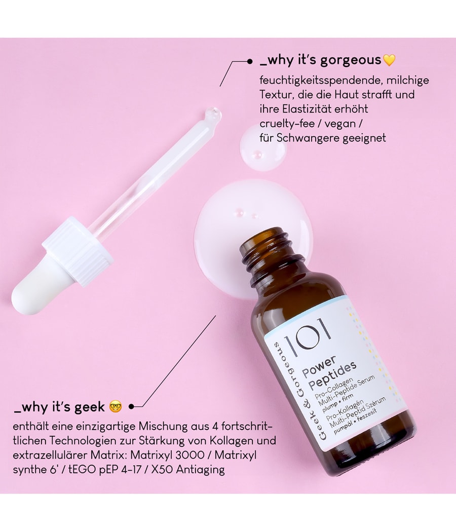 С сывороткой Power Peptides от Geek & Gorgeous вы получаете высокоэффективную проколлагеновую мультипептидную сыворотку, которая противодействует всем признакам старения кожи и эффективно сокращает морщины. Доказано, что содержащиеся в нем пептиды делают кожу более упругой и эластичной, стимулируя выработку коллагена и других важных компонентов кожи. В то же время формула прекрасно увлажняет, поэтому вам не понадобится дополнительная увлажняющая сыворотка. При использовании в дуэте с Geek & Gorgeous A-Game 5 или A-Game 10 вы получите особенно эффективную комбинацию для умного старения. Сначала используйте Power Peptides, затем A-Game и, наконец, любимый увлажняющий крем.