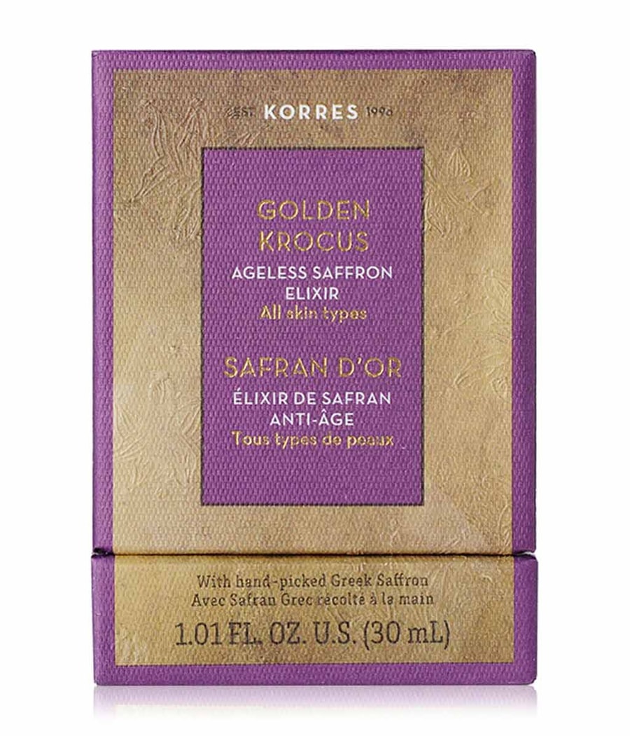 Антивозрастной эликсир KORRES Golden Krocus обеспечивает кожу антиоксидантной силой греческого органического шафрана с защищенным наименованием места происхождения из Козани, известного во всем мире своим выдающимся качеством. Уникальные свойства этого ценного ингредиента были объединены в революционную формулу и эффективно противодействуют всем признакам старения кожи. Инновационный эликсир красоты содержит греческий шафран, который собирают вручную каждый день, чтобы сохранить его оптимальную антиоксидантную силу. В сочетании с бета-глюканами, пептидами и аминокислотами он повышает упругость кожи, придает ей естественное сияние и заметно уменьшает признаки старения кожи. Эликсир идеально подходит для всех потребностей кожи, ее состояний и возрастных групп. Улучшает объем, тон и текстуру кожи, уменьшает появление морщин и линий, придает коже новую эластичность и упругость.