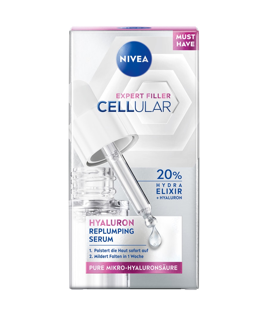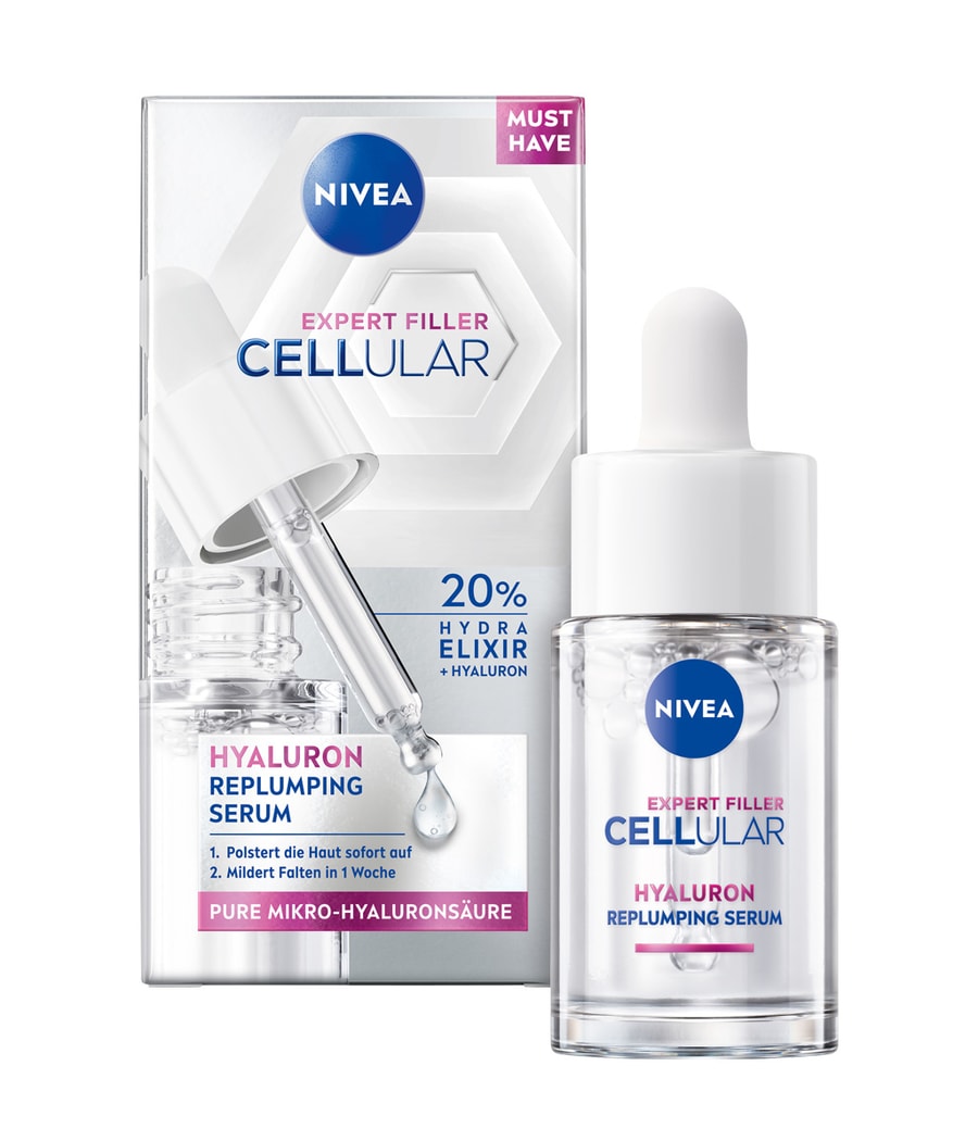Гиалуроновая сыворотка NIVEA CELLULAR Expert Filler Plumping — эффективное решение, которое восстанавливает собственные запасы влаги в коже и заметно разглаживает ее поверхность. Откройте для себя легкую, быстро впитывающуюся и нелипкую текстуру сыворотки с 20% HYDRA ELIXIR + HYALURON. Формула с: 1) Чистой микрогиалуроновой кислотой, мощной увлажняющей молекулой, естественным образом присутствующей в коже, усиливает собственное удержание влаги кожей и эффективно заполняет морщины. 2) Глицерин, естественным образом присутствующий в коже и известный своей способностью смягчать кожу, безопасно делая ее более гладкой и эластичной. Эта сыворотка входит в линейку NIVEA CELLULAR Expert Filler и может использоваться вместе со всей линейкой NIVEA на каждом этапе ухода за кожей.