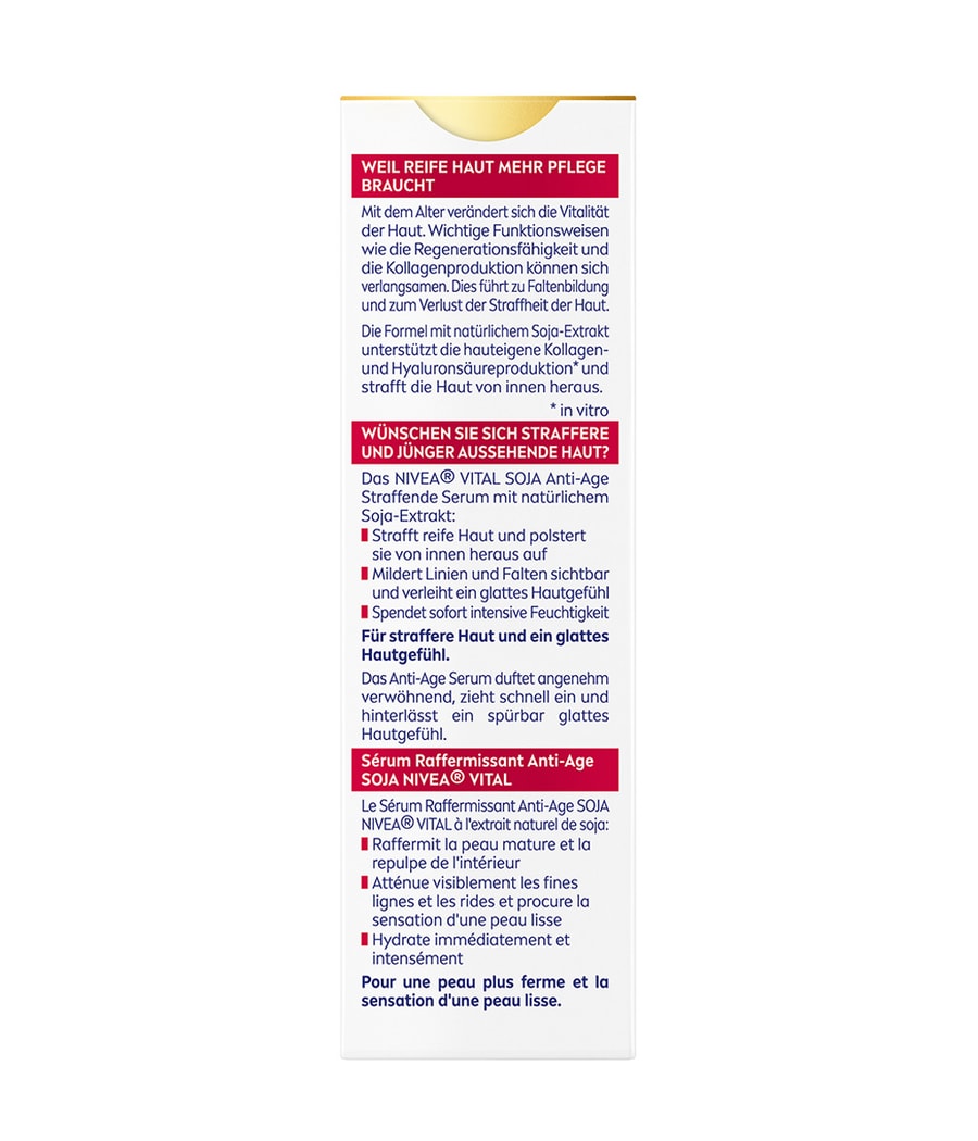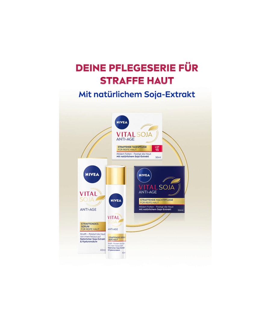 Укрепляющая сыворотка NIVEA VITAL Soy Anti-Age была специально разработана для потребностей требовательной зрелой кожи. С возрастом поведение клеток кожи меняется. Могут замедлиться такие важные функции, как способность к регенерации и выработка коллагена. Это приводит к образованию морщин и потере упругости и естественного сияния кожи. Антивозрастная сыворотка подтягивает зрелую кожу и наполняет ее изнутри. Он также заметно уменьшает морщины, придает коже ощущение гладкости и обеспечивает мгновенное интенсивное увлажнение. Для более упругой и гладкой кожи. Текстура быстро впитывается и имеет приятный аромат. Укрепляющая сыворотка NIVEA VITAL Soja Anti-Age для упругой и здоровой кожи.
