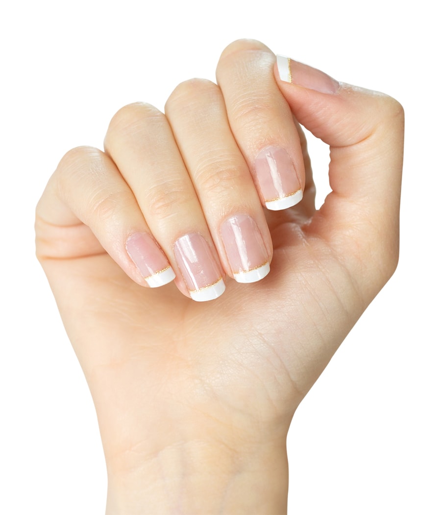 Французский маникюр с изысканным изюминкой – это наши дизайнерские деликатные советы. Полупрозрачная полубелая пленка для ногтей с минималистичным золотым орнаментом привлекает всеобщее внимание, когда вы говорите "да", и привлекает всеобщее внимание к вашим рукам.