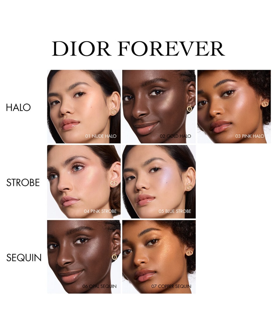 Dior Forever заново изобрел свою светящуюся пудру-хайлайтер в трех новых вариях1 для отражения света под любым углом: Halo для придания блеска кристаллам, Strobe2 для дуохроматического мерцания и Sequin для придания блеска образу.