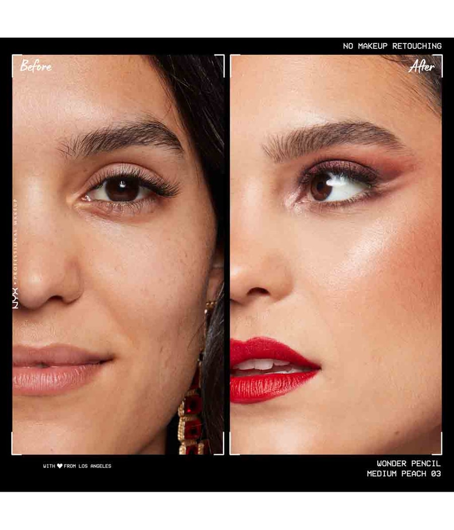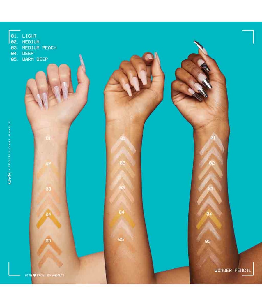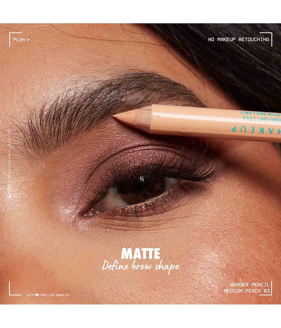 Wonder Pencil от NYX Professional Makeup - это ручка с микро-подсветкой, которая имеет две стороны с различными нюансами, которые подходят для выделения, покрытия и подтяжки. При этом матовая сторона отличается ультра-кремовой и легко растушевываемой формулой, которая оставляет гладкую и естественную поверхность. Мерцающая сторона состоит из микронизированных бусинок, которые подходят к любому тону кожи и обеспечивают наращиваемое свечение. Его эластичная скользящая формула особенно подходит для нанесения на область вокруг глаз и губ, в то время как его практичный размер можно использовать и в дороге.