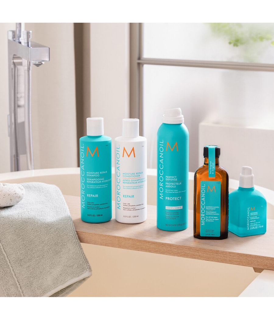 Нанесите шампунь Moroccanoil для восстановления влаги на влажные волосы и кожу головы. Продолжайте добавлять воду, чтобы образовалась густая пена из высококонцентрированной смеси. Тщательно промойте, пока вода не станет прозрачной. При необходимости повторите и промойте с помощью увлажняющего кондиционера Moroccanoil.
