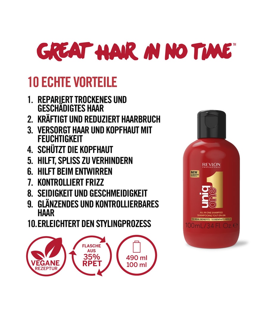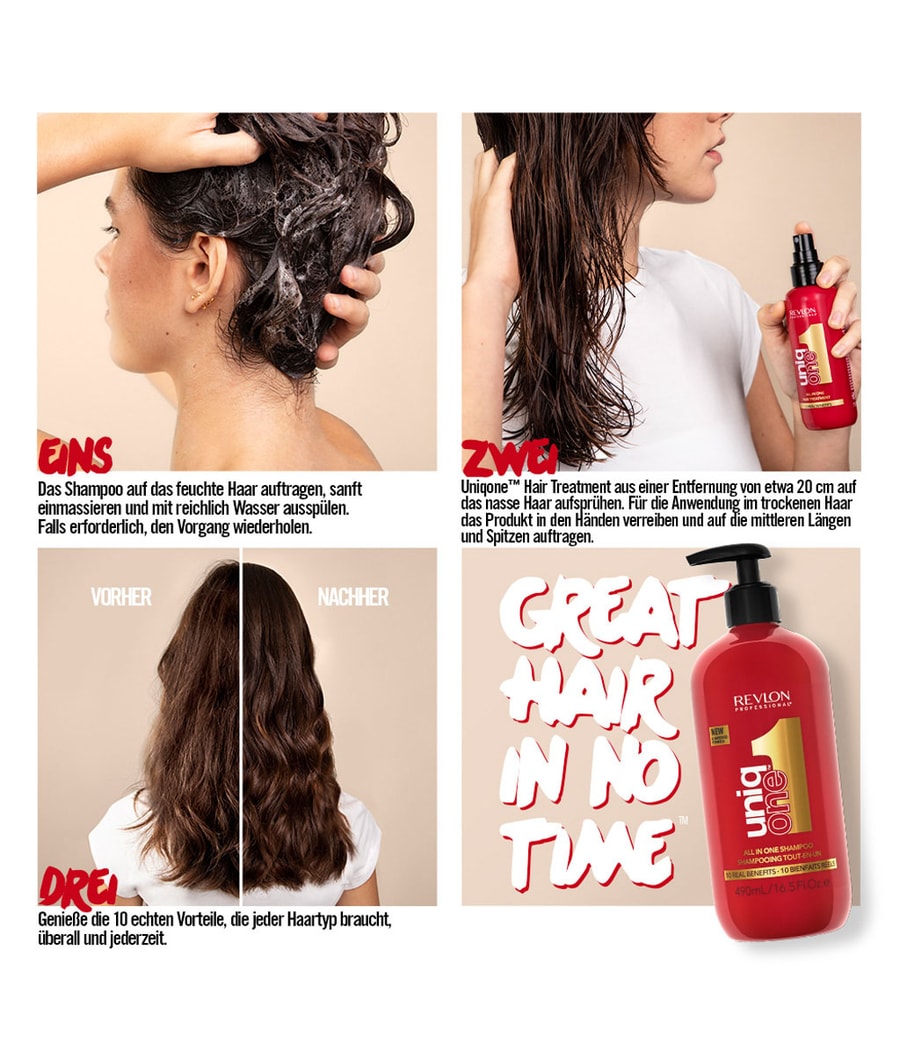 Способ применения: Просто нанесите средство для волос на влажные волосы и аккуратно помассируйте. Затем тщательно промойте и повторите по мере необходимости. Для достижения наилучших результатов дополните программу UniqOne Hair Treatment. UniqOne ALL IN ONE – die Multi-Benefit-Pflege.
