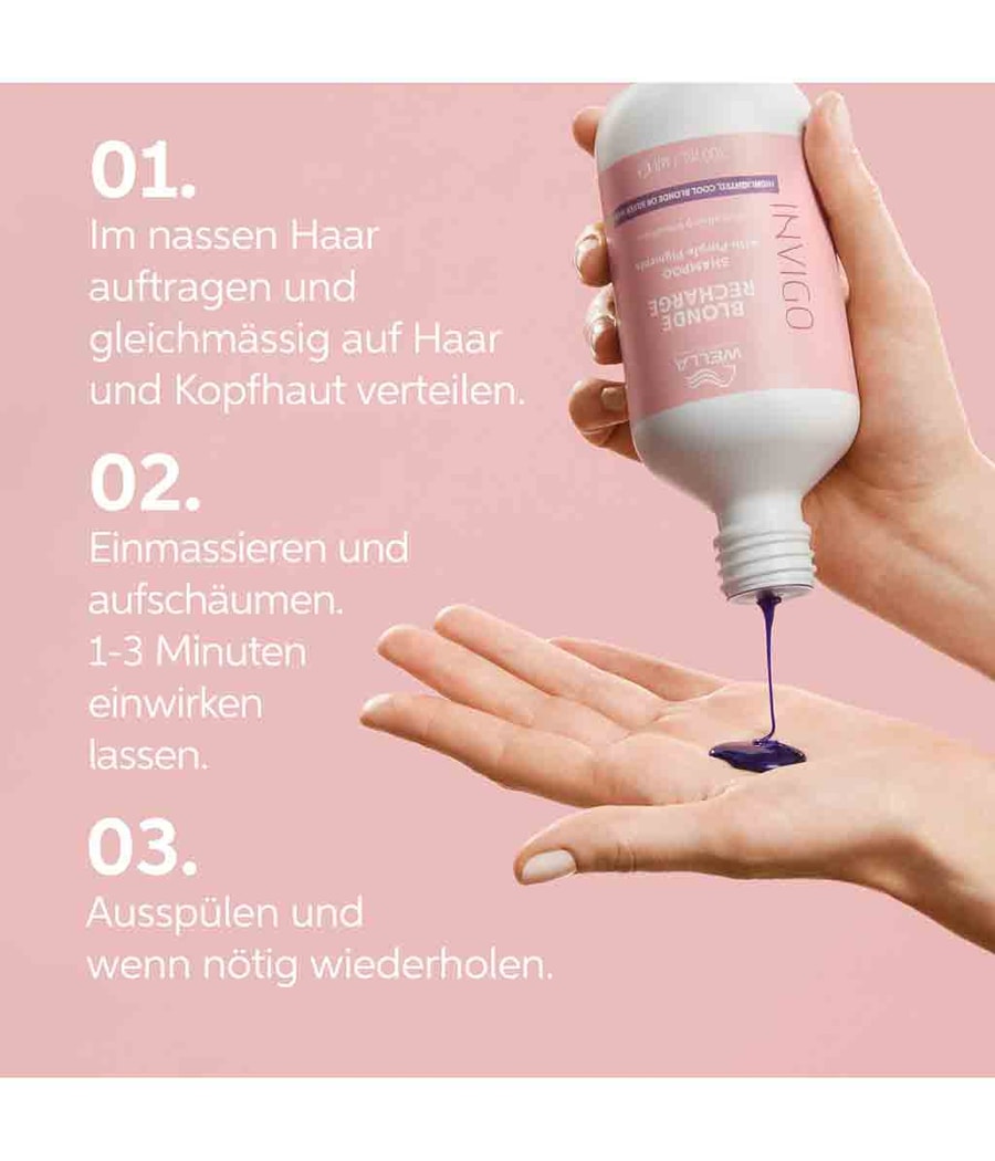 Придайте вашему лучшему оттенку блондинки сияние – Освежающий шампунь Invigo Blonde Recharge Color Освежающий шампунь Cool Blonde освежает волосы Придайте яркости осветленной блондинке и устраните медные тона. Этот шампунь эффективно насыщает ваши волосы цветными пигментами благодаря своей стимулирующей формуле, обогащенной витамином Е, с нежным цветочным ароматом. Нанесите на влажные волосы и равномерно распределите по коже головы и волосам. Помассируйте и нанесите пену на 1-3 минуты. Промойте и при необходимости повторите.
