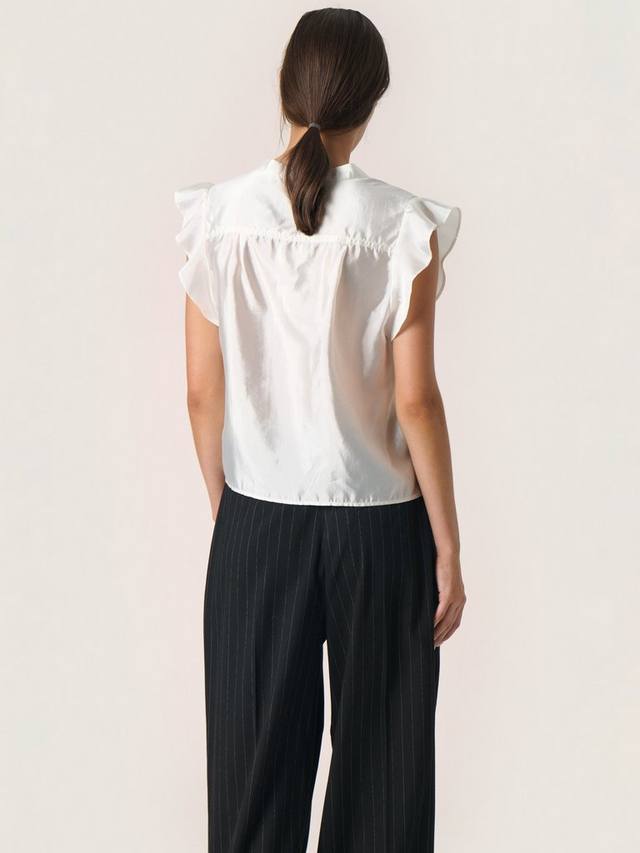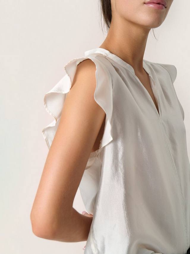 Блузка Karolina - женственный и универсальный топ, который вы можете надеть по любому поводу. У нее V-образный вырез с воротником-лентой и обычная посадка. Блузка имеет рукава-колпачки с оборками и складки ниже плеч.