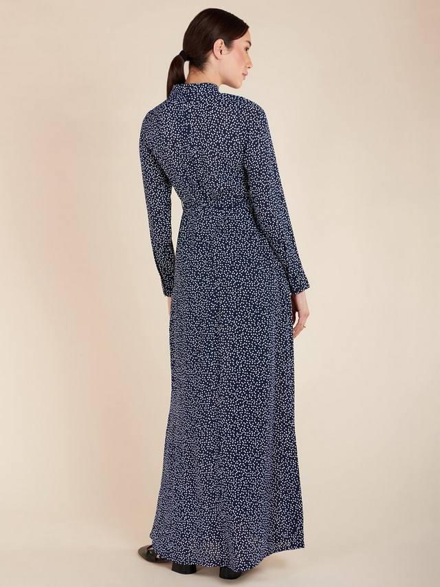 Это платье макси с высоким воротом и ярким рисунком в горошек. Оно также имеет потайную молнию сзади и возможность добавления пояса. Кроме того, вы можете дополнить его собственным поясом для создания более индивидуального образа. Платье имеет плавный силуэт А-силуэта и неброские боковые карманы.