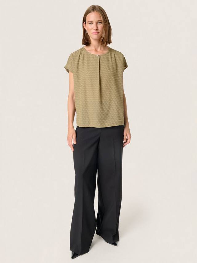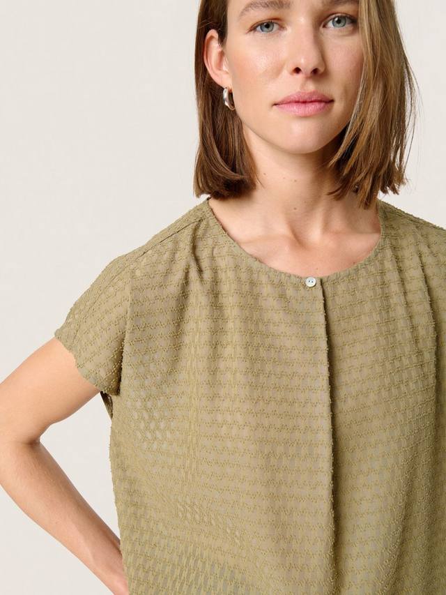 Топ Kettie - это простой повседневный фасон, который будет отлично смотреться как с брюками, джинсами, так и с юбкой. У него круглый вырез с застежкой на пуговицы и мягкая складка, а также обычная посадка. Рукава - короткие, как у летучей мыши, а верх выполнен из красивой текстурированной ткани.
