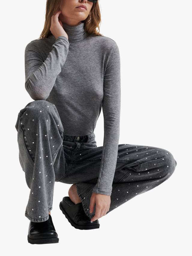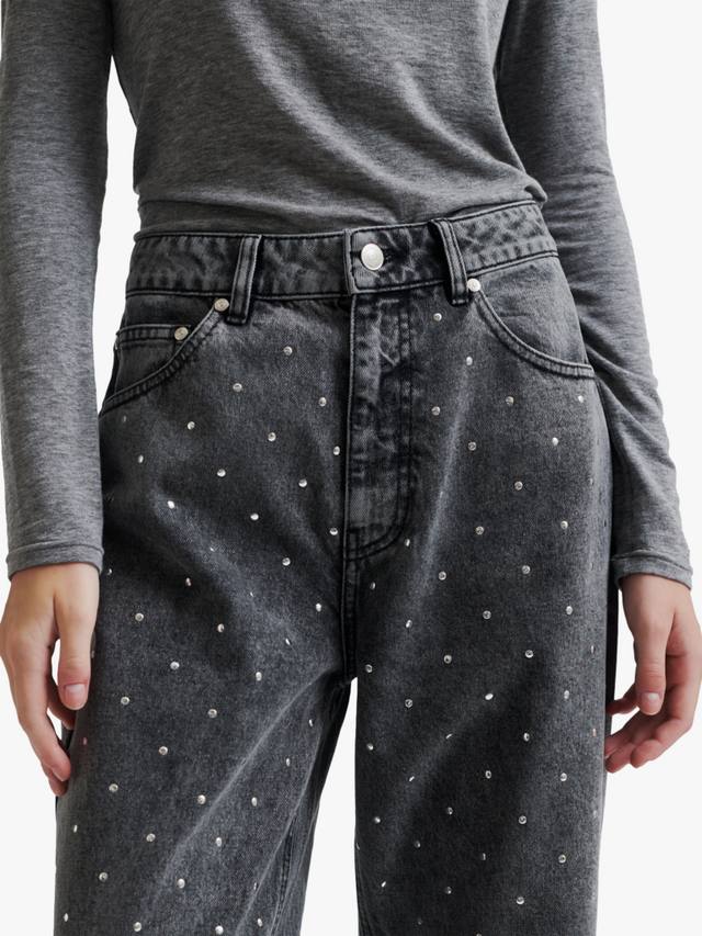 Джинсы выполнены из хлопчатобумажного денима с прострочкой в тон. С 5 карманами и фирменной серебристой фурнитурой. Маленькие плоские заклепки по всей передней части джинсов. Средняя талия, широкие прямые штанины.