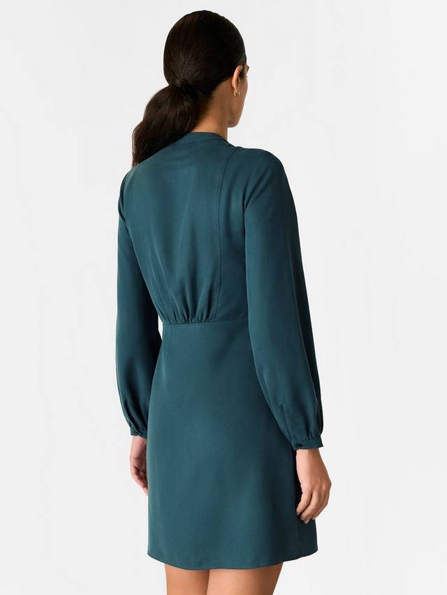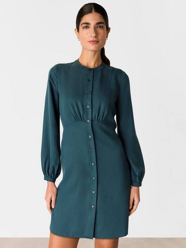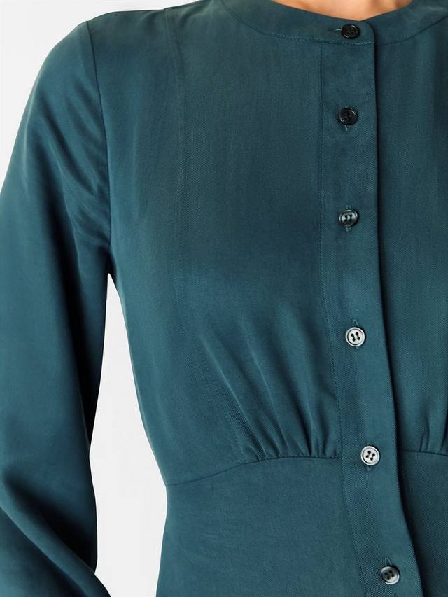 Это мини-платье от Whistles простой А-силуэтной формы с волнистым подолом выполнено из легкой ткани и застегивается спереди на пуговицы. Простое платье с круглым вырезом и длинными рукавами без лишних украшений.
