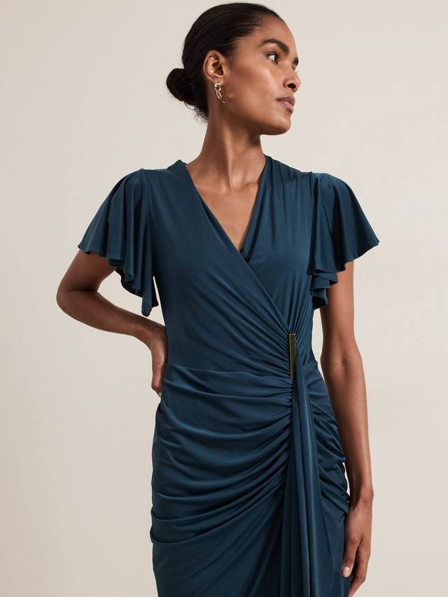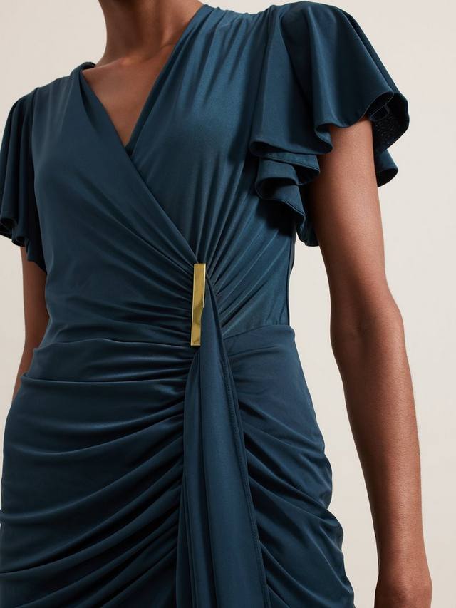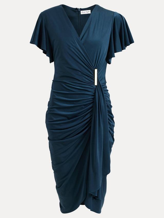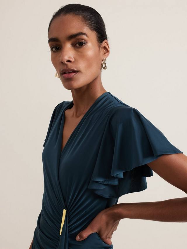 Это платье длиной до колен от Phase Eight с привлекательными рюшами по всему телу сшито из эластичной смеси тканей для сверхкомфортного ношения. Приталенный вырез с запахом и короткие рукава-фонарики дополнены драпировкой в виде водопада на талии. Идеальный выбор для вечерних мероприятий.