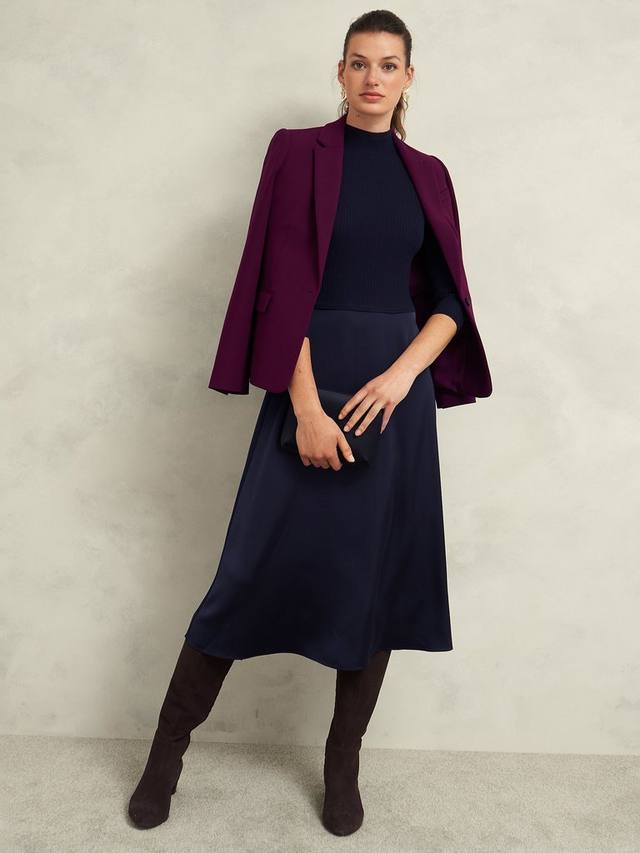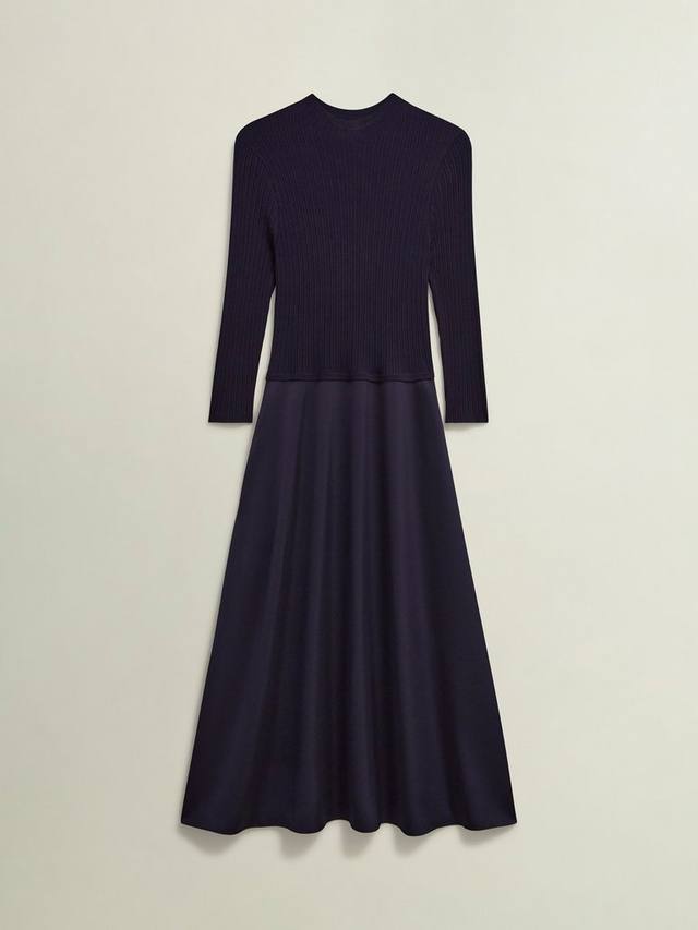 Твое новейшее рабочее платье Trina не требует никаких усилий для того, чтобы надеть его рано утром. Модель с трикотажным лифом в рубчик и роскошной атласной юбкой длиной миди легко переходит границы сезонов.