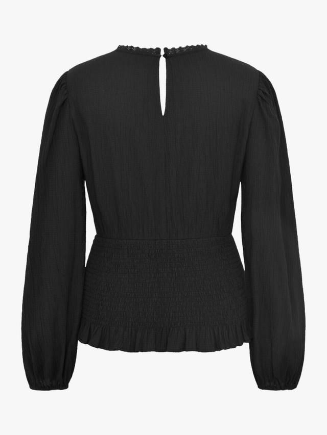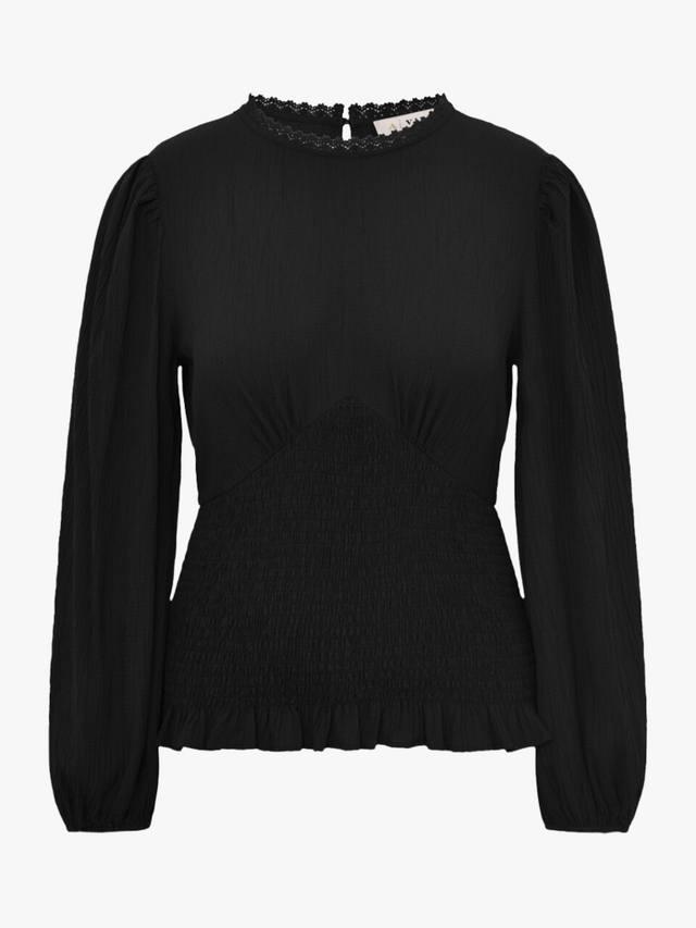 Блузка Helen - это облегающая блузка из структурированного материала. Блузка поднимается к горловине и имеет красивый кружевной край. Блузка имеет присборенные детали спереди и застегивается сбоку на молнию.