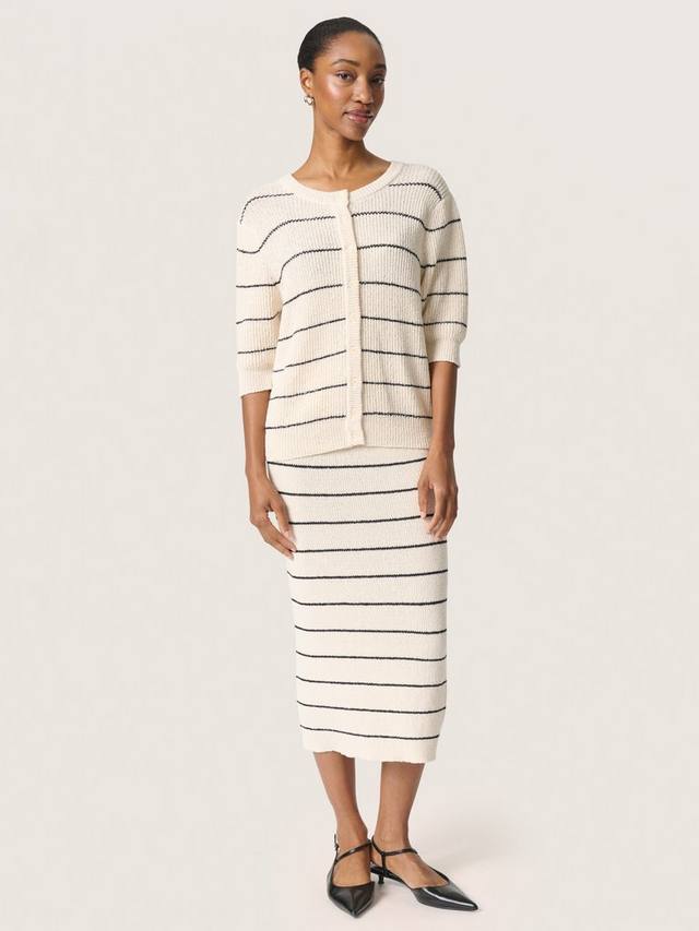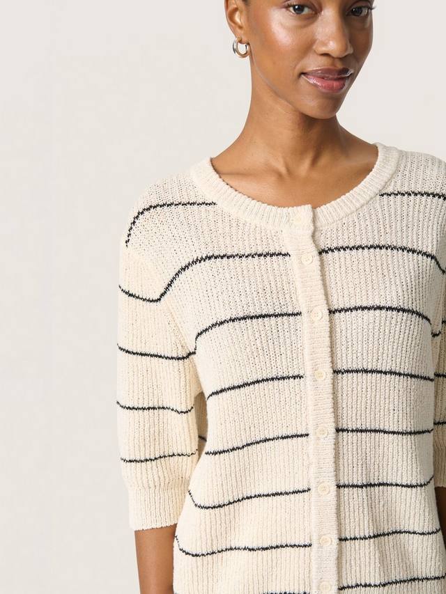 Кардиган Winta одновременно уютный и стильный, и это идеальное дополнение к вашему гардеробу в этом сезоне. У него круглый вырез и застежка на пуговицы, он выполнен из плотного ребристого трикотажа в полоску. Рукава до половины длины свободного покроя, а кардиган разрезан на бедрах.