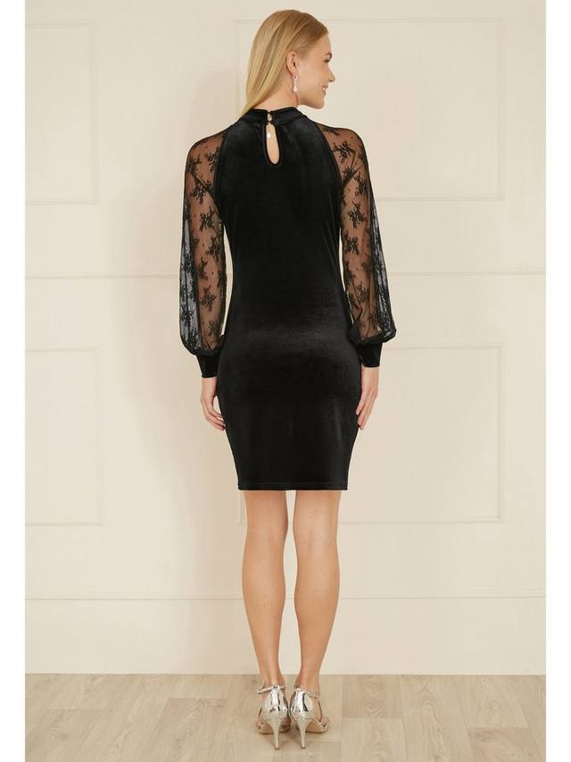 Бархатный тренд никуда не денется, и это облегающее приталенное платье идеально подчеркнет его! С прозрачными кружевными рукавами и высоким вырезом, создающим иллюзию короткой шеи. Мы любим это для более модных приглашений или для вечернего выхода в свет в этот праздничный сезон.