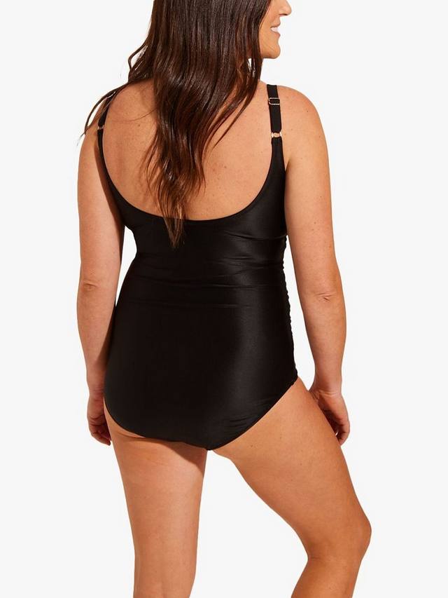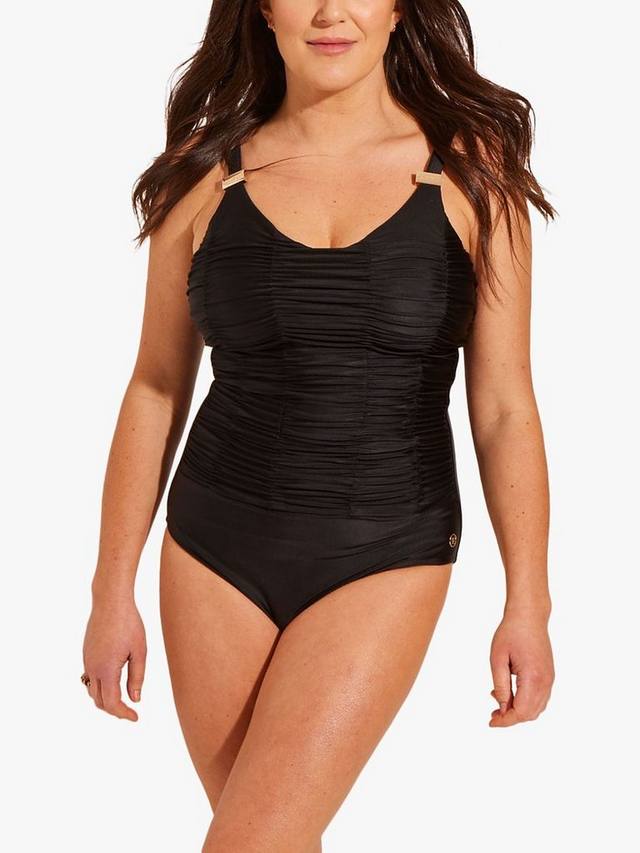 Этот универсальный и изысканный черный купальник Helena, несомненно, произведет впечатление в любой обстановке. Все дело в мельчайших деталях: стильные рюши в складку создают привлекательный силуэт, а изящные детали золотой отделки и регулируемые бретельки обеспечивают идеальную посадку. Потрясающая технология tummy control power mesh придаст форму и контур, добавляя комфорта этой облегающей фигуре. Дополнительная ткань, окружающая животик, также позволит вам почувствовать себя максимально красивой, когда вы заходите в воду.
