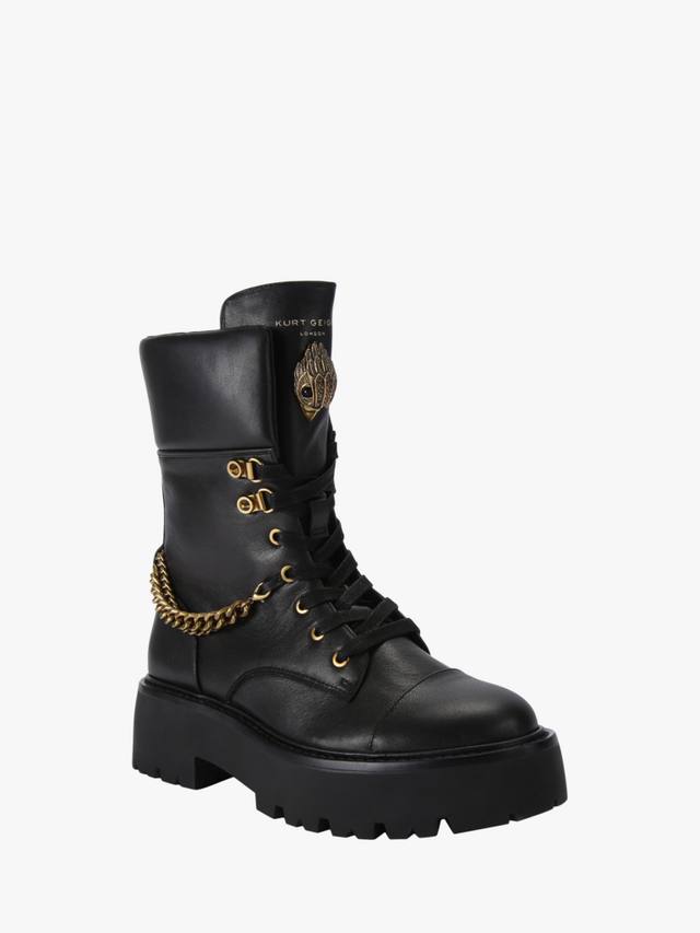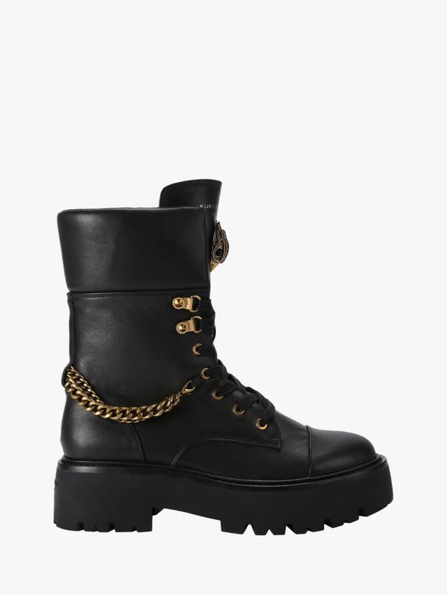 Армейские ботинки Kensington от Kurt Geiger London выполнены из черной кожи. Спереди эффектная шнуровка со старинными латунными проушинами, а сзади на щиколотке цепочка в тон. Со старинной латунной головкой орла на язычке они застегиваются на боковую молнию для легкого доступа.