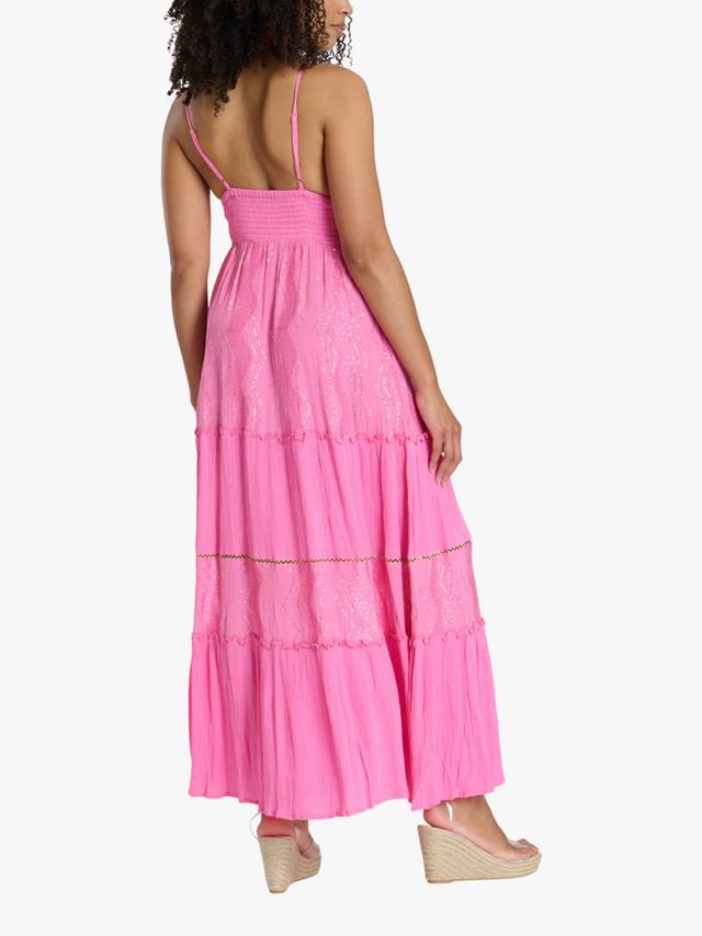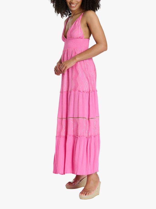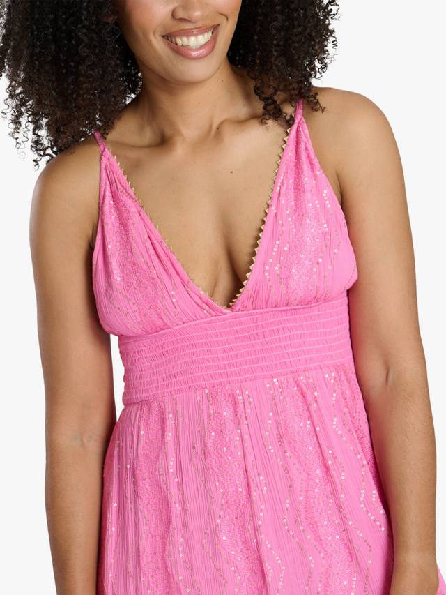Макси-платье на бретелях с блестками - ослепительное и элегантное изделие, созданное для особых случаев. Это платье с тонкими бретельками на бретельках и замысловатыми блестками по всей поверхности прекрасно улавливает свет, добавляя немного блеска. Струящийся силуэт макси предлагает изящество и комфорт, что делает его идеальным для вечерних мероприятий, свадеб или летних вечеров вне дома. Благодаря неподвластному времени дизайну и гламурной отделке это платье позволит вам выглядеть стильно.