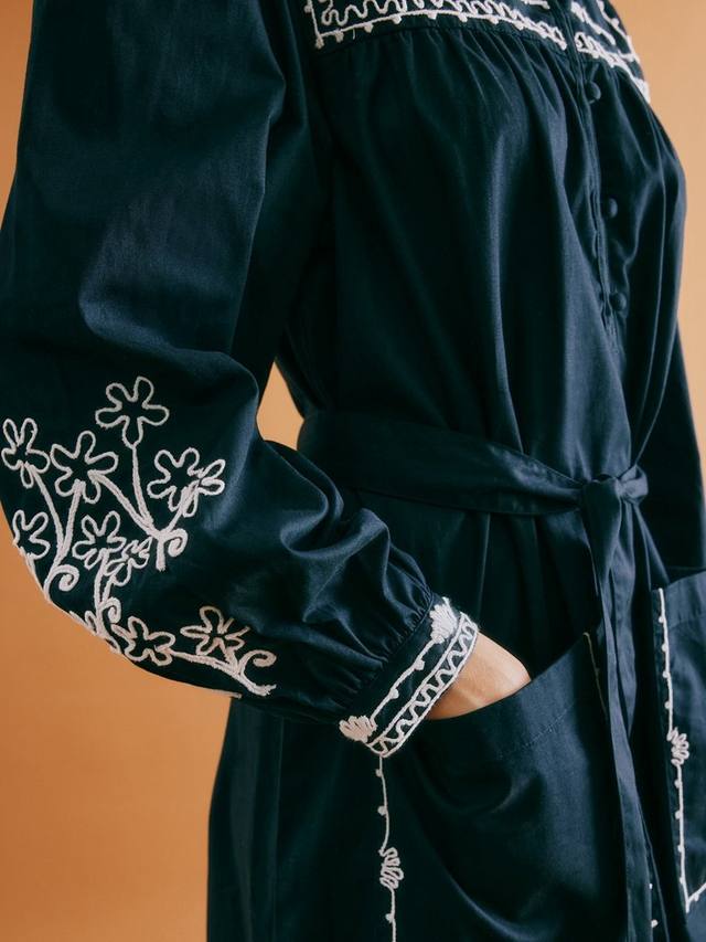 Искусно выполненное с вышивкой, это платье миди отличается стилем и функциональностью. Это платье с рюшами на шее, потайными пуговицами и рукавами-блузонами отличается уникальным дизайном, который идеально подойдет для любого случая. Силуэт А-силуэта обеспечивает свободную посадку или может быть затянут с помощью пояса для более индивидуального образа. Кроме того, платье оснащено накладными карманами для дополнительного удобства. Украсьте свой гардероб этим универсальным и шикарным платьем.