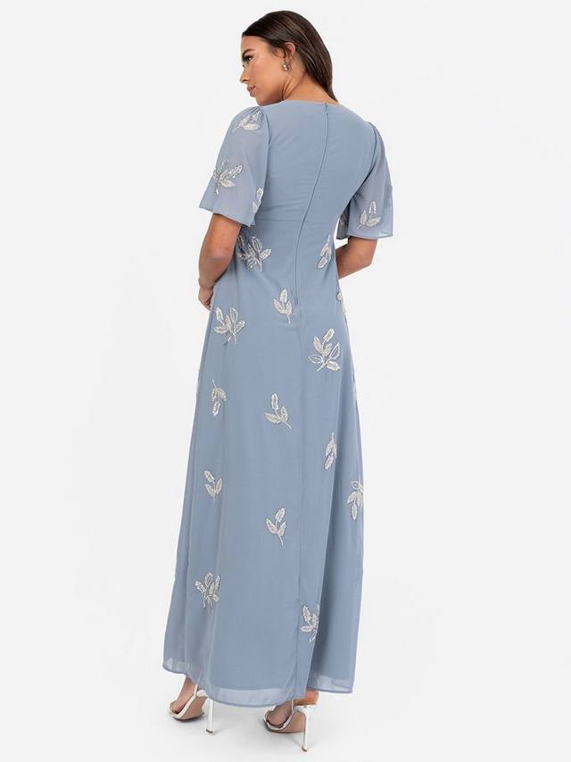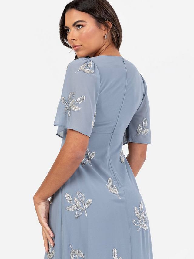 Идеальный выбор для летних свадеб и особых случаев. Неподвластный времени лиф украшен мерцающими блестками и бусинами, а элегантные короткие рукава в виде ангелочков придают ему воздушную грацию. Изящная закругленная деталь у основания V-образного выреза придает классическому дизайну современный вид. Юбка макси А-силуэта красиво украшена серебристыми мотивами в тон, создавая цельный и отточенный образ. Просто дополните это платье серебристыми ремешками на каблуках и изящным ожерельем.