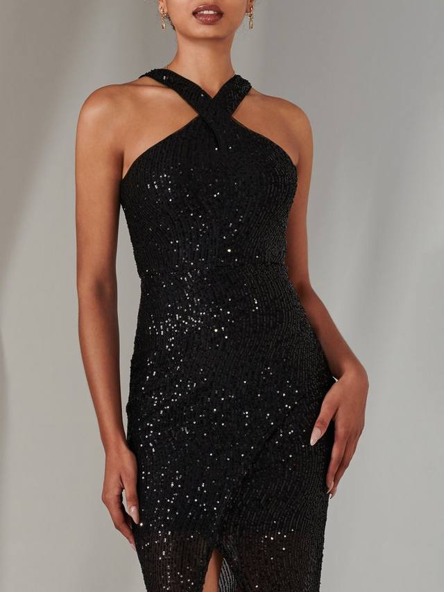 Облегающее платье с перекрестным вырезом и разрезом от Jolie Moi - эффектное изделие, идеально подходящее для гламурных вечеров. Это платье без рукавов и с соблазнительным перекрестным вырезом элегантно подчеркивает ваши плечи. Украшенное мерцающими блестками, оно при каждом движении переливается на свету, гарантируя, что все взгляды будут прикованы к вам. Облегающий силуэт дополнен смелым разрезом, добавляющим драматизма. С удобной застежкой на молнию сзади для бесшовной посадки.