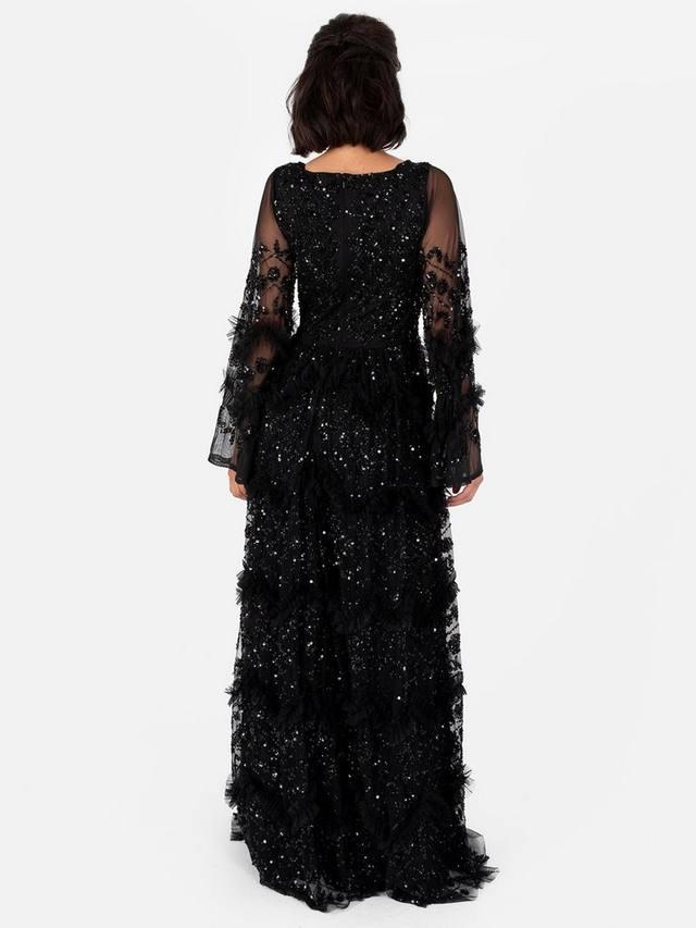 Появитесь на своем следующем мероприятии на красной дорожке в этом мерцающем макси. Точно сшитые вручную украшения на облегающем лифе и прозрачных расклешенных рукавах подчеркивают внимание Maya к деталям, образуя элегантные ряды блесток. Оборки на юбке идеально сочетаются с мерцающими блестками, которые продолжаются на макси-юбке, а разрез по бокам до бедра придает утонченность этому очаровательному изделию. Дополните образ серебристыми аксессуарами и ремешками на каблуках.