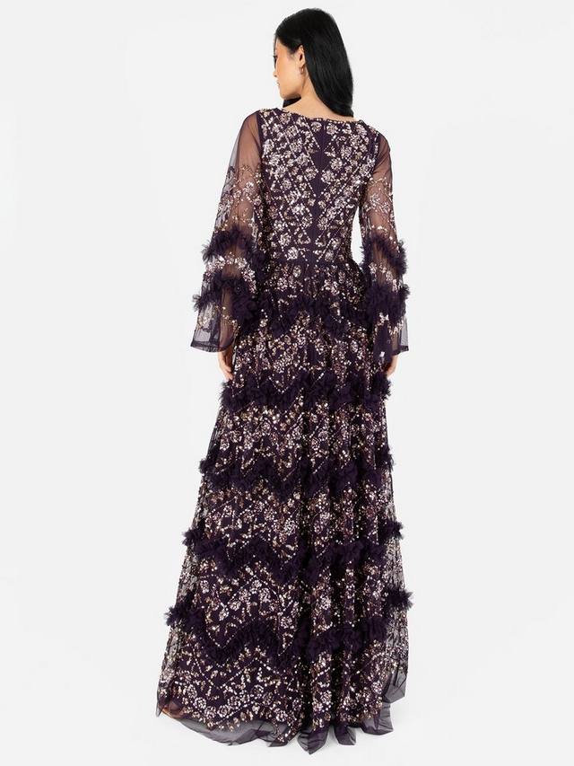 Появитесь на своем следующем мероприятии на красной дорожке в этом мерцающем макси. Точно сшитые вручную украшения на облегающем лифе и прозрачных расклешенных рукавах подчеркивают внимание Maya к деталям, образуя элегантные ряды блесток. Оборки на юбке идеально сочетаются с мерцающими блестками, которые продолжаются на макси-юбке, а разрез по бокам до бедра придает утонченность этому очаровательному изделию. Дополните образ серебристыми аксессуарами и ремешками на каблуках.
